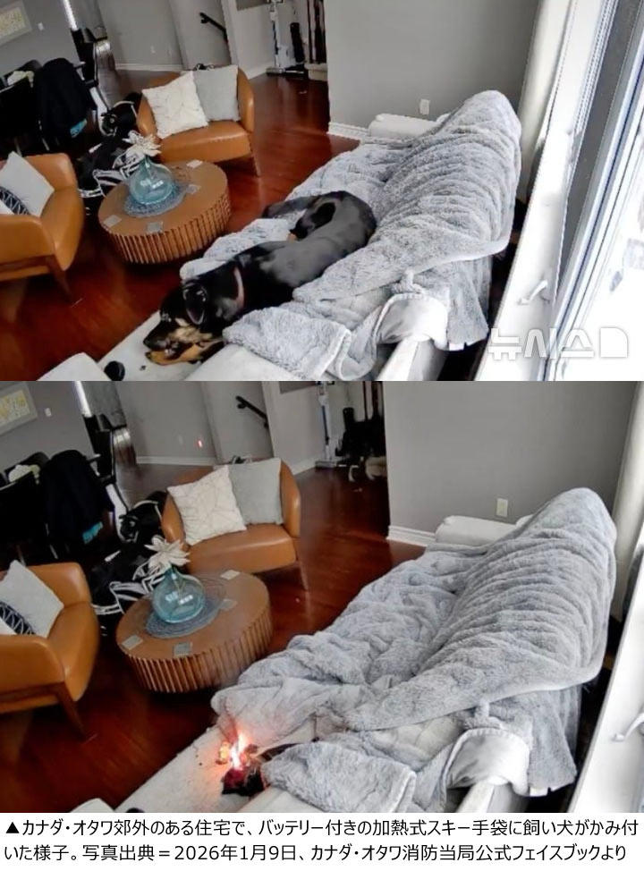 消防当局が交流サイト(SNS)公式アカウントで公開した防犯カメラ映像には、飼い犬がソファーの上で手袋にかみ付いてバッテリーが損傷し、煙が発生した後に火がつく様子が写っていた。煙が出ると、飼い犬は手袋を落として慌ててその場を離れ、部屋に入っていった。