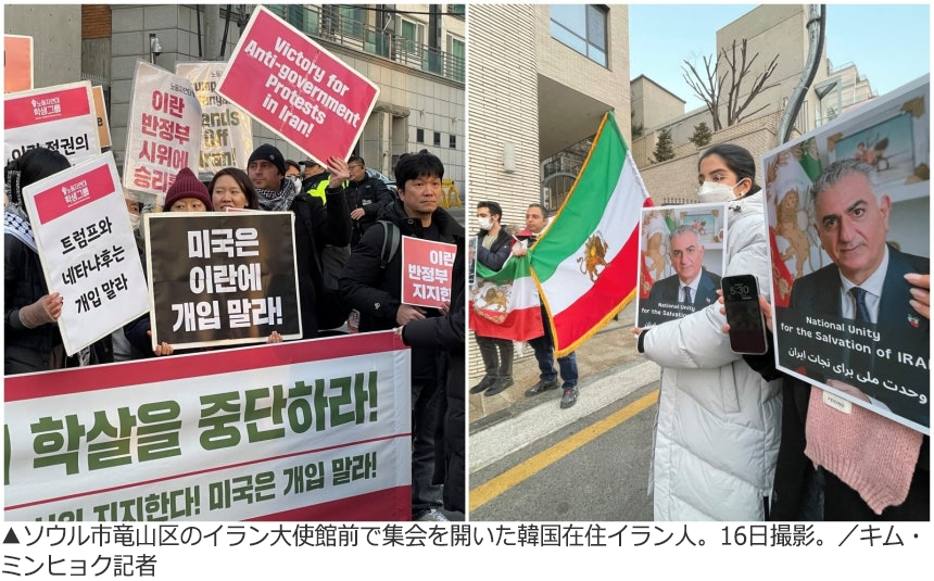 ソウル市竜山区のイラン大使館前で16日、幅10メートル前後の道路を挟んで韓国の労働者団体と韓国在住イラン人たちがそれぞれ集会を開いた。米国は先日、反政府デモが続くイランへの軍事介入の可能性を示唆したが、これに対してマルクス主義と反米を掲げる「労働者連帯」の活動家たちが同日イラン大使館前で「米国政府はイランから手を引け」と主張した。するとこれに対抗して数メートル離れた道路を挟んだ反対側で、十数人のイラン人たちが「あなたたちの主張はイラン人に死ねという意味だ」「イラン人の切実な思いを聞いてほしい」と訴えた。