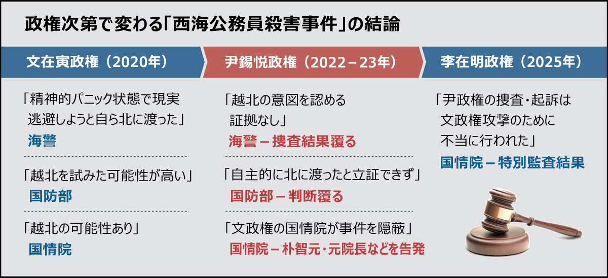 判決文を通して、韓国軍の合同参謀本部(合参)が、当初「失踪推測時間帯の潮流は北から南に流れており、越北の可能性は低いと評価」と言っていた事実も判明した。その後、当時の文大統領は「国防部(省に相当)の発表が断定的」「遺体を焼く蛮行を確認したという表現を使ったが、断言できるのか」と言った。事実上、叱責(しっせき)したのだ。その後、海洋警察(海警)は捜査チームの反対にもかかわらず「越北で間違いない」と押し付けた。