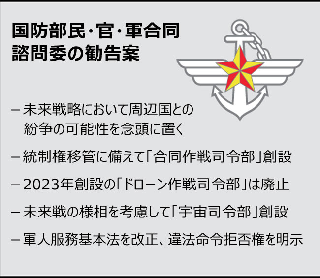 国防部によると、民・官・軍合同特別諮問委の未来戦略分科委員会が活動を終え、このような改善案をまとめて勧告した。分科委は勧告案において「各軍のドローン関連機能が重複して非効率的な状況で、ドローン戦闘の発展案を統合的に推進する方がよい」とした。代わりに、宇宙安全保障の状況や未来戦の様相を考慮し、宇宙司令部創設の必要性に言及した。
