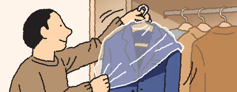 ドライクリーニングした服のビニールカバーはすぐにはがしてからハンガーにかけておこう。ビニールカバーを取って通気性を良くすれば、湿気やにおいが取れ、生地も傷みにくい。