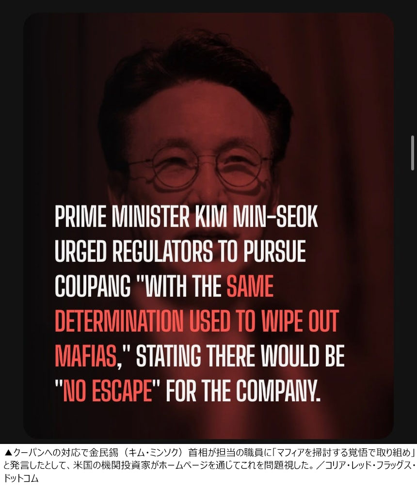両社は「金民錫(キム・ミンソク)首相は規制担当の政府職員らに対し『マフィアを掃討する覚悟で取り組め』と発言した」としてこの点も問題視した。さらに「韓国は中国と同じ道を進んでいる」とした上で「クーパンはカカオペイ、アップビット、アリ・エクスプレス、SKテレコムなど他社に比べて不当な仕打ちを受けている」と訴えるためのホームページまで登場した。