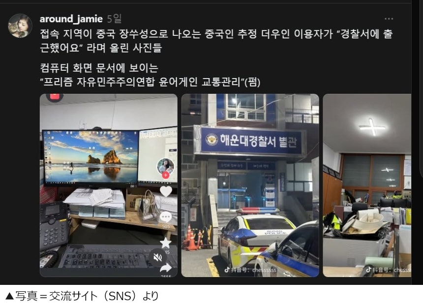 中国の交流サイト(SNS)上に釜山海雲台警察署の事務室内部を撮影した写真が掲載され、物議を醸している。写真には警察の業務スペースやコンピューター画面がそのまま写っており、インターネット上を中心にセキュリティーや安全保障に対する懸念の声が上がっている。