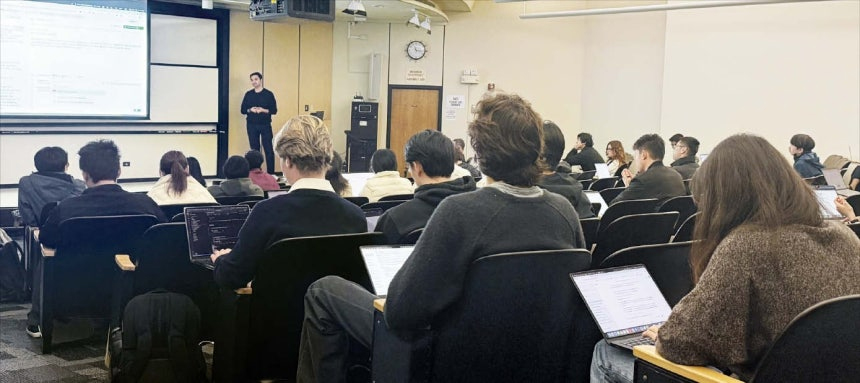 この授業はChatGPTやGeminiなどのAIモデルを使い、実際に使用可能なアプリやサービスを作成する「ブートキャンプ(新兵訓練所)」形式で進められる。課題も試験もない。約60人の学生がチームを組み、10週間かけてAIでアプリやサービスを開発し、成果物を発表する。経営学など他の学科の学生も十数名参加している。1時間30分の授業の中で、プログラミング用のコードには一言も言及せず、代わりに「コミュニケーション能力」が何度も強調されていた。講師のジョン・ウェイリー氏は「同僚や顧客はもちろんのこと、AIとも上手なコミュニケーションができなければ、いい結果は生まれない」として「学生たちにチームを組ませて2週間ごとに発表させるのも、そういう目的があるからだ」と話した。