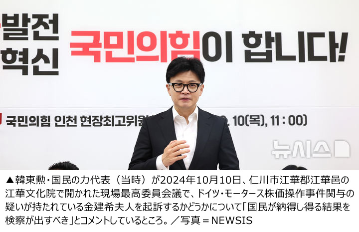 【戒厳令2カ月前】金建希夫人株価操作疑惑巡り「検察は国民が納得し得る結果を出すべき」と語る韓東勲・国民の力代表(2024年10月10日)