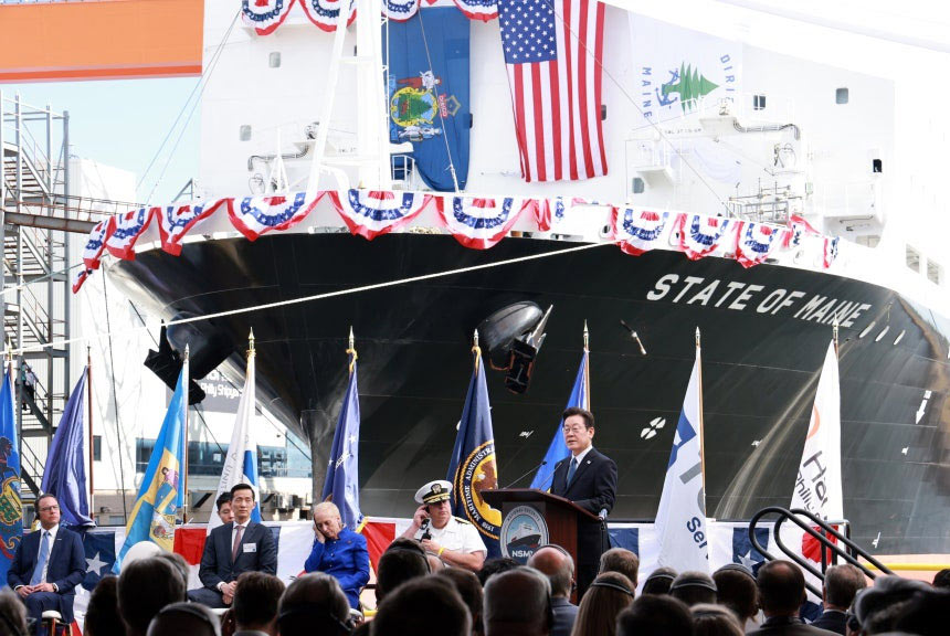 ▲米フィラデルフィアのフィリー造船所で祝辞を述べる李在明(イ・ジェミョン)大統領。李在明大統領2025年8月26日(現地時間)、米海洋庁が発注した国家安保多目的船「ステート・オブ・メイン」の命名式に出席した。/NEWSIS