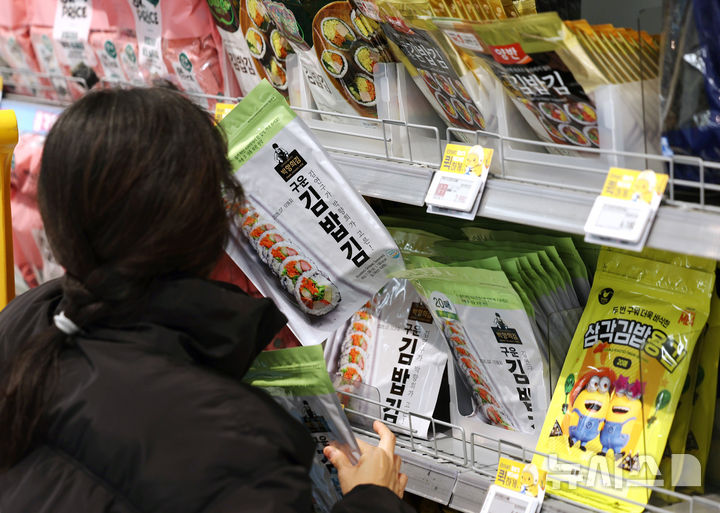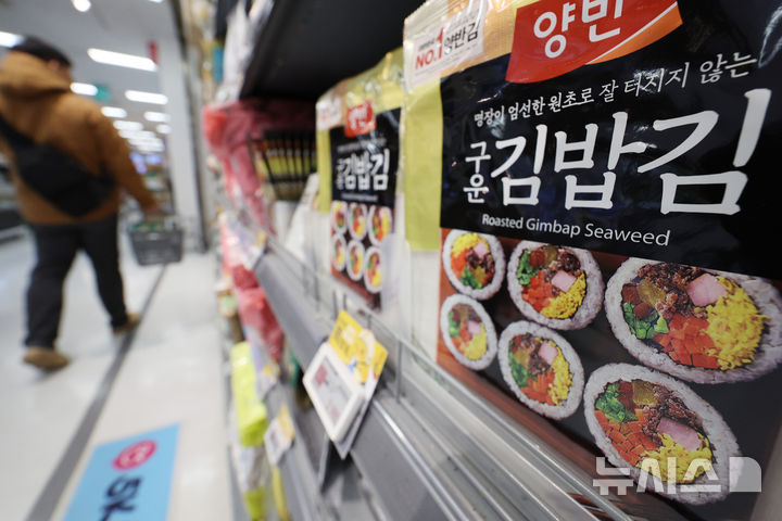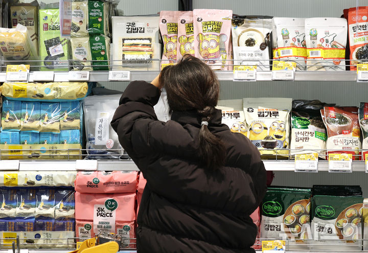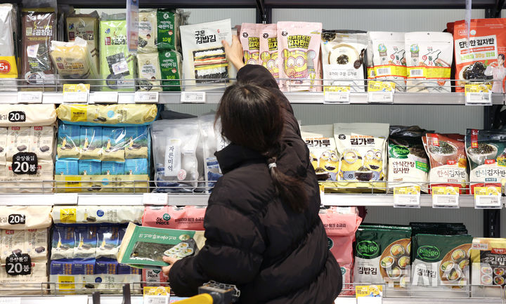 2日の韓国農水産食品流通公社(KAMIS)の価格情報によると、乾燥のり(中等品)の平均小売価格は、1月下旬現在で10枚あたり1515ウォン(約160円)。旬で見た乾燥のりの平均小売価格が1500ウォンを超えるのは史上初めてだ。写真は2日、ソウル市内のある大手スーパーに陳列してあるのりの様子。