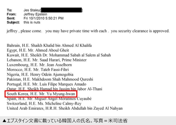米司法省が公開した故ジェフリー・エプスタイン氏に関する資料で、韓国人の氏名の英語表記が確認された。