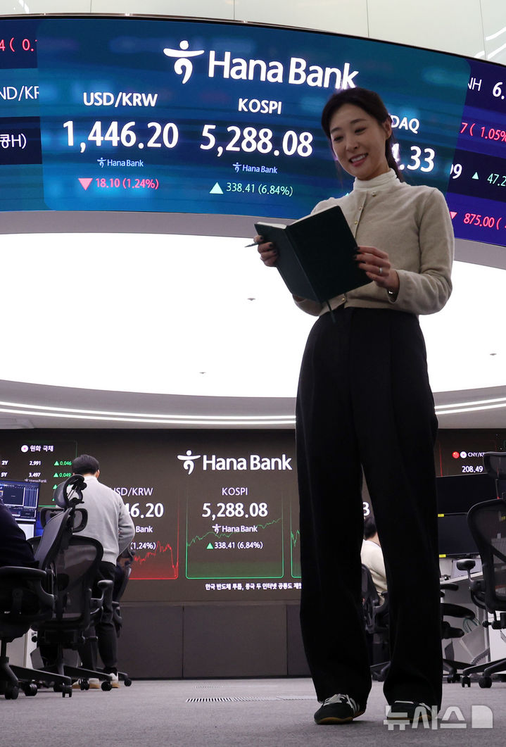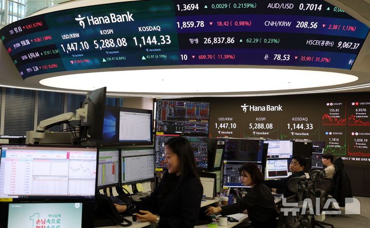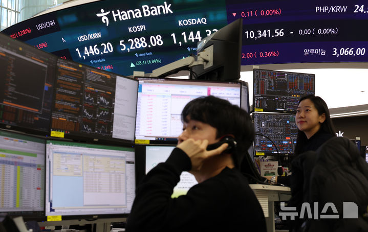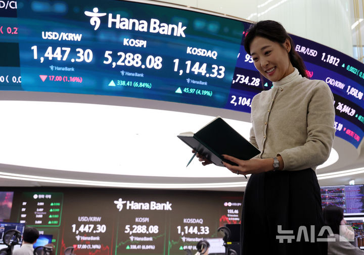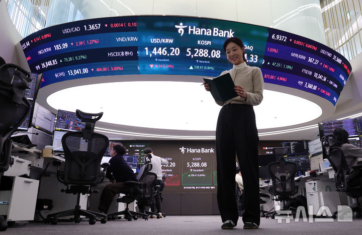 【NEWSIS】韓国総合株価指数(KOSPI)が前取引日(4949.67)より338.41ポイント(6.84%)高い5288.08で取引を終えた3日午後、ソウル市中区のハナ銀行ディーリングルームの電光掲示板に表示された指数。