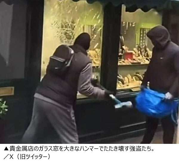 BBCなど海外メディアが1日(現地時間)、報じた。それによると、事件は1月31日午前10時30分ごろ、ロンドン南西部リッチモンド地域にある宝石店で発生。現場で撮影された動画を見ると、覆面をかぶった強盗2人が大きなハンマーで店の窓ガラスを割っている。1人はガラス部分を持って外そうとし、もう1人はショーウィンドウに並んだ貴金属をバッグに詰めている。