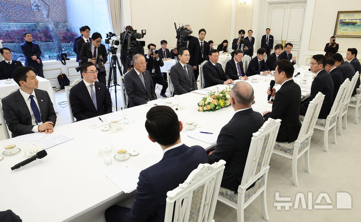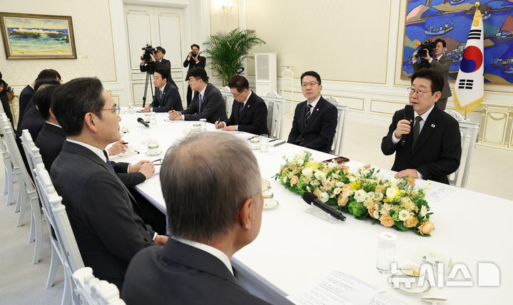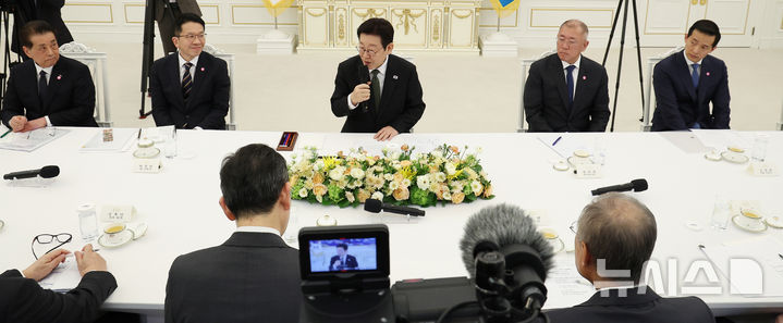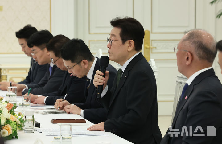 【NEWSIS】韓国の李在明(イ・ジェミョン)大統領が4日、青瓦台(韓国大統領府)で開かれた青年雇用および地方投資拡大のための企業懇談会で発言しているところ。