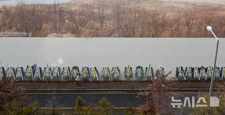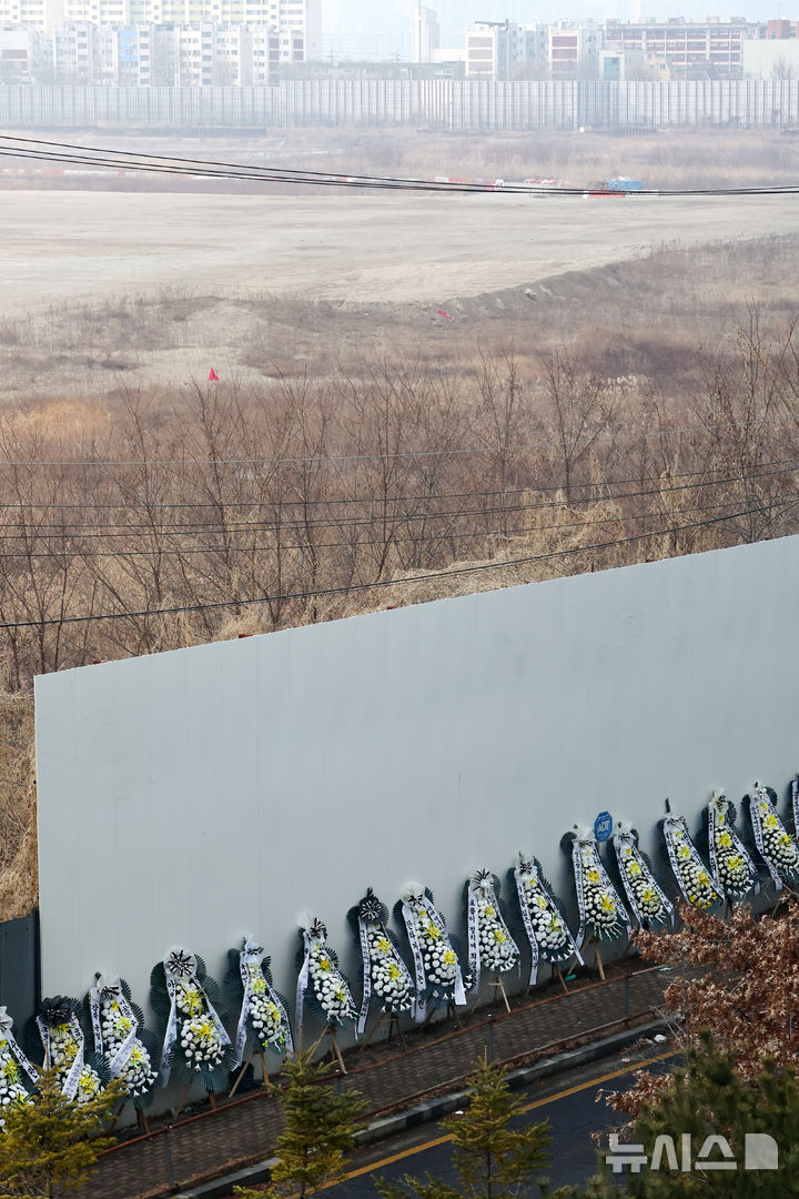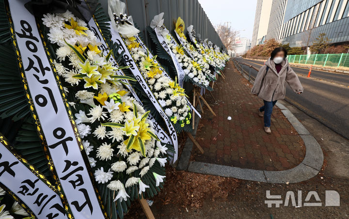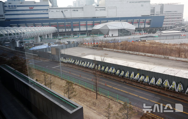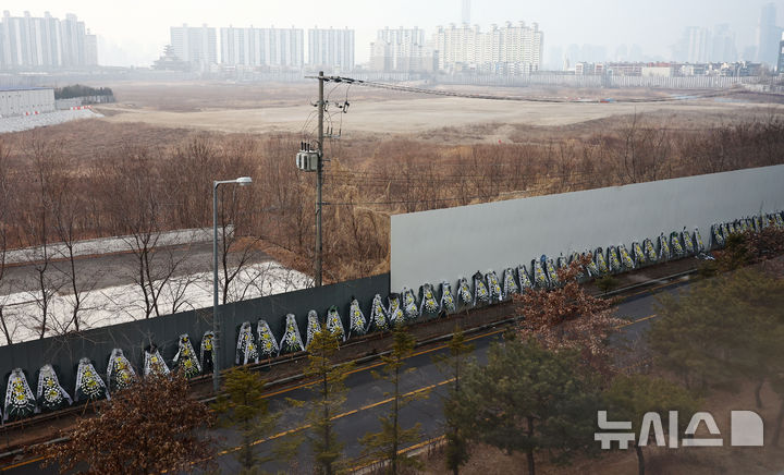 【NEWSIS】5日午前、ソウル市竜山区の竜山国際委業務地区工事現場のフェンス沿いに、韓国政府の供給対策に抗議する内容が記された「謹弔花環」が並んでいる様子。