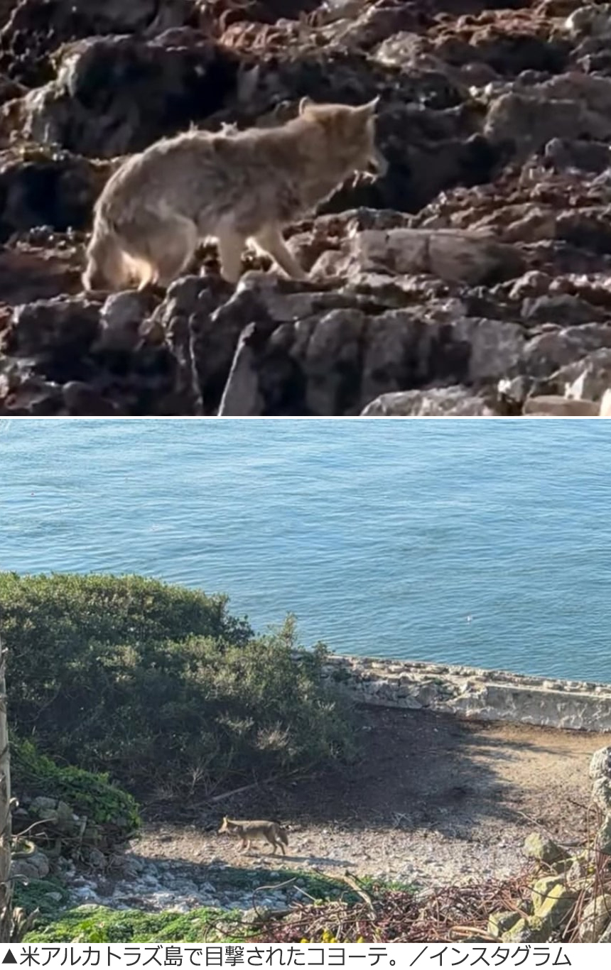 米紙ニューヨーク・タイムズ(NYT)によると、最近SNS(交流サイト)には、アルカトラズ島の海岸の岩場に上がろうとするコヨーテの動画がアップされた。コヨーテは骨と皮だけの..