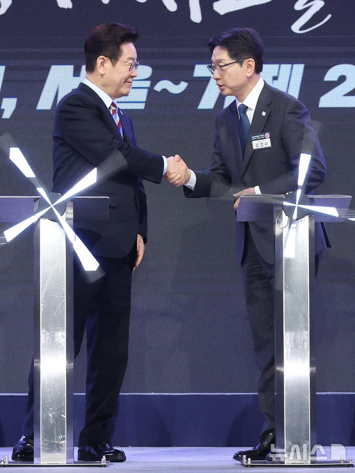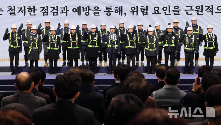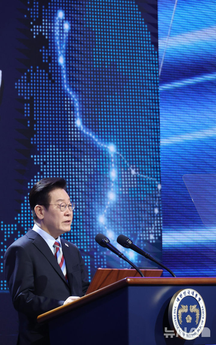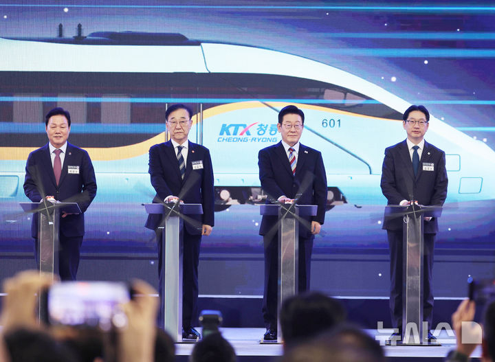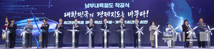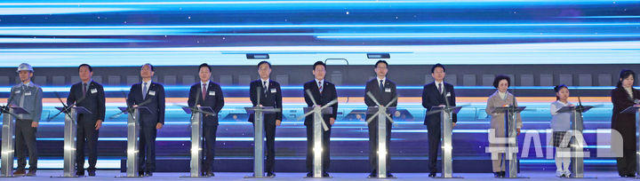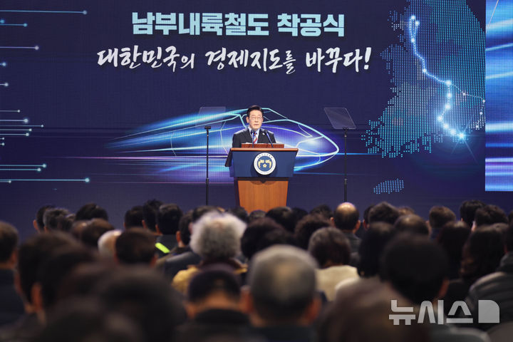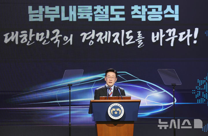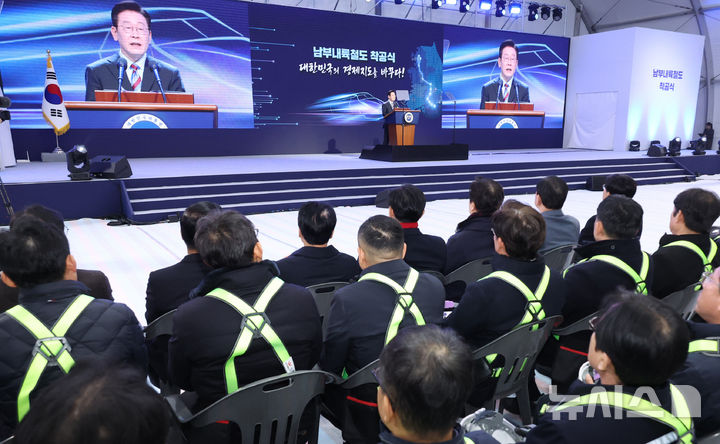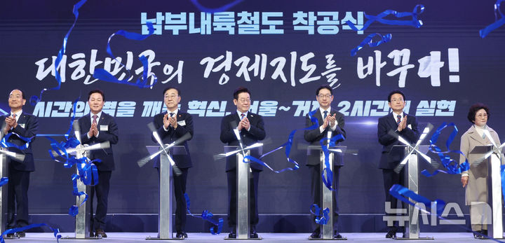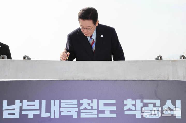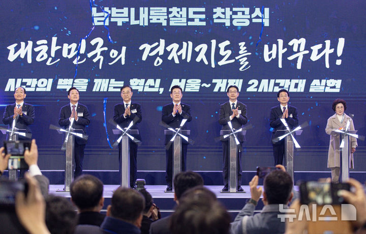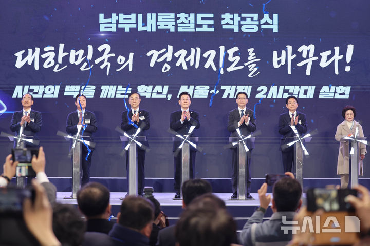 【NEWSIS】韓国の李在明(イ・ジェミョン)大統領が6日、慶尚南道巨済市の見内梁付近で開かれた南部内陸鉄道着工式典で、出席者らと共に記念セレモニーを行っている様子。