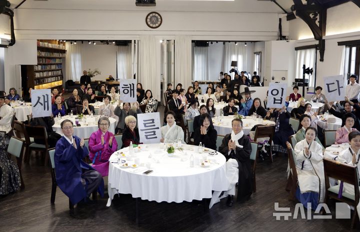 【NEWSIS】韓国の李在明(イ・ジェミョン)大統領の配偶者である金恵京(キム・ヘギョン)夫人が6日、ソウル市中区の貞洞1928アートセンターで開かれた「2026旧正月韓服人新年会」で、鄭淳勲(チョン・スンフン)韓服世界化財団理事長から韓服名誉広報大使推戴の盾を受け取って記念撮影をしているところ。