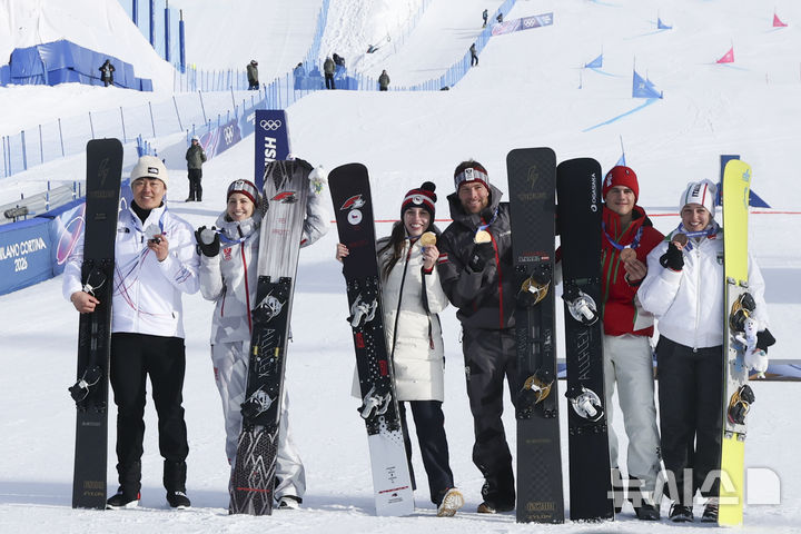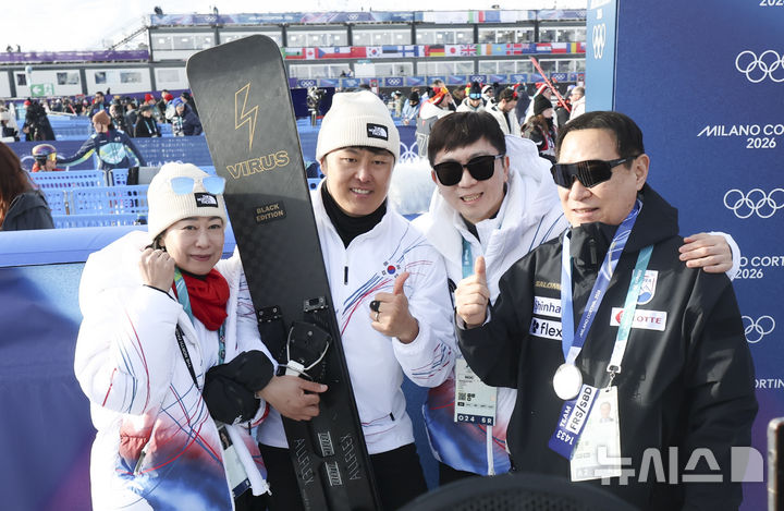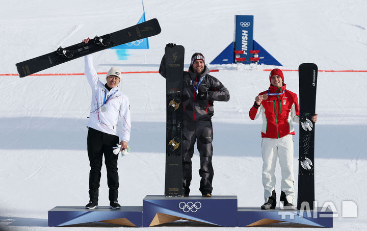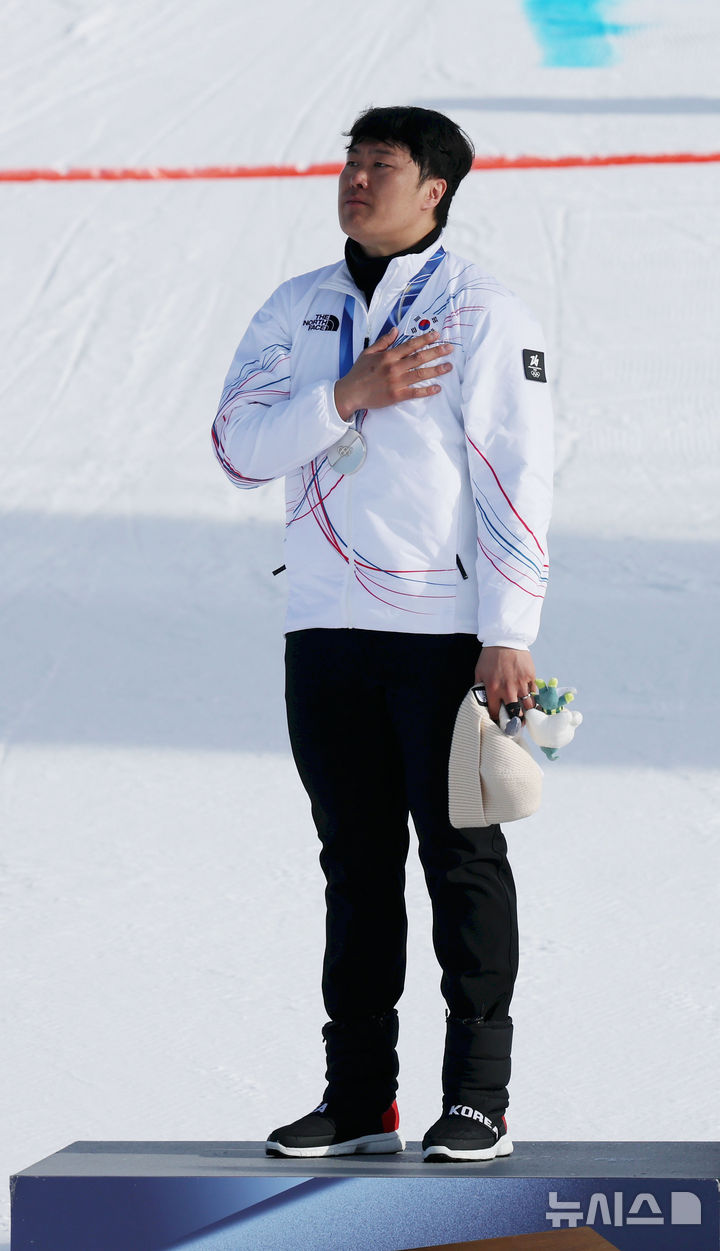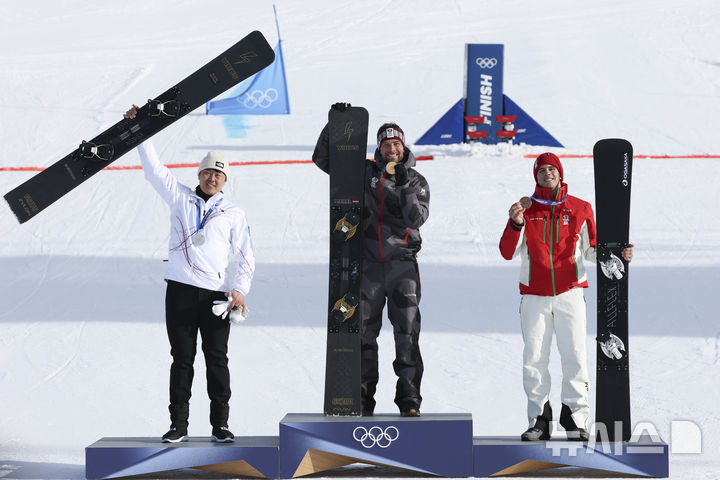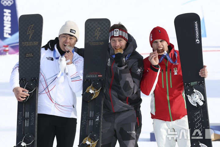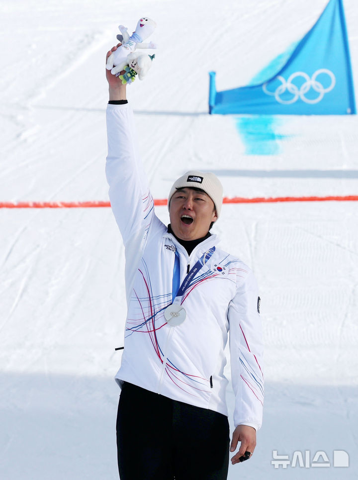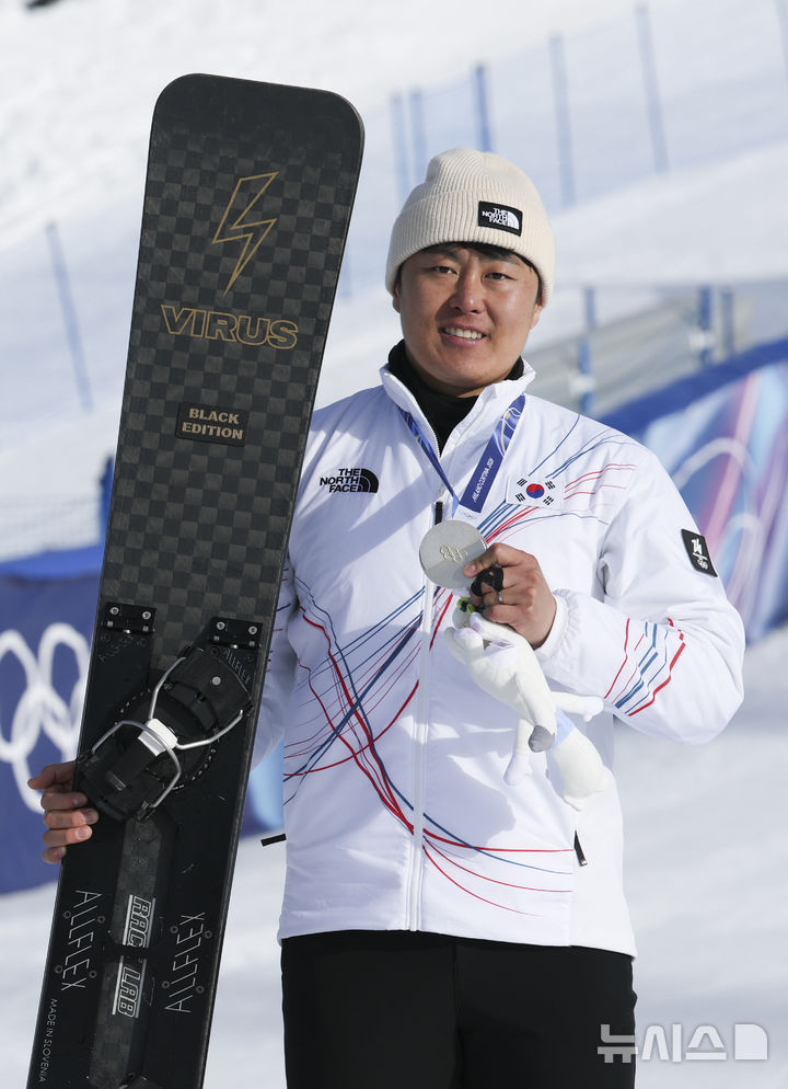 【NEWSIS】8日(現地時間)、イタリアのリビーニョ・スノーパークで行われた2026年ミラノ・コルティナダンペッツォ冬季五輪のスノーボード男子パラレル大回転授賞式後、銀メダルを手にポーズする金相謙(キム・サンギョム)。
