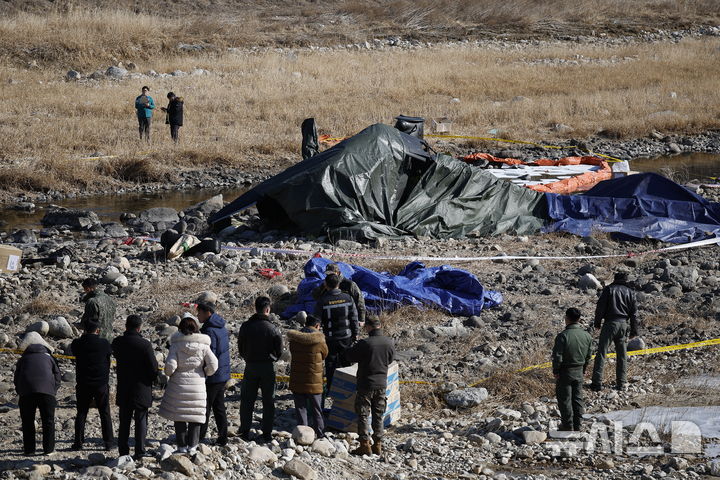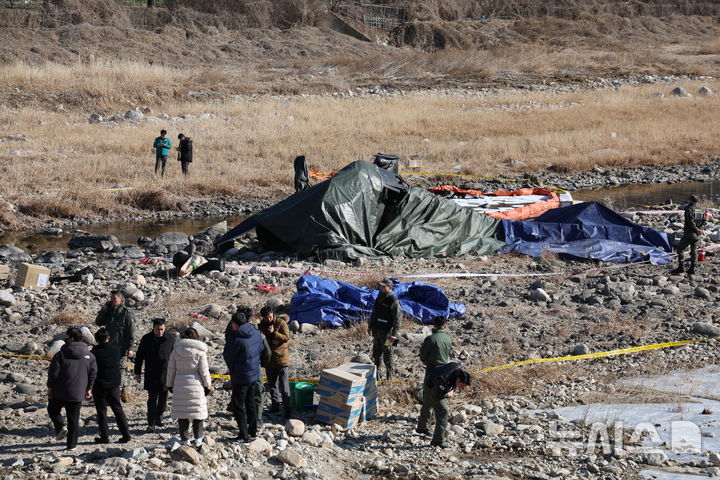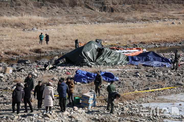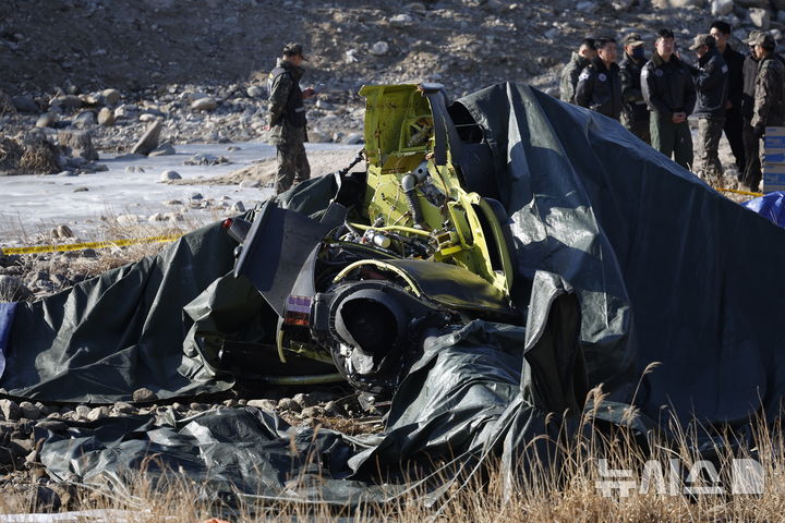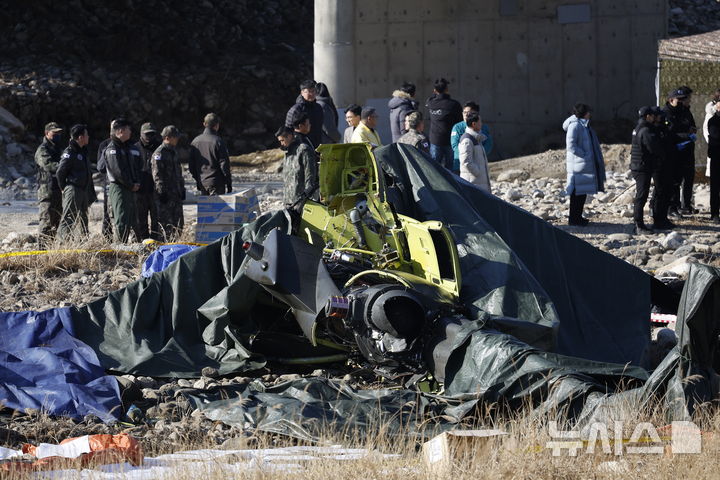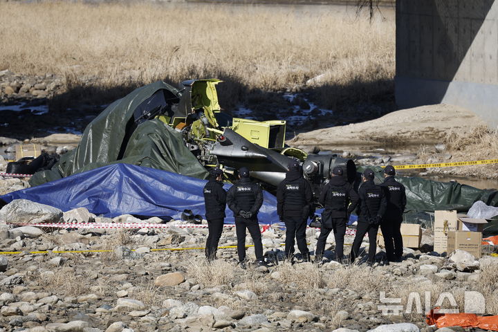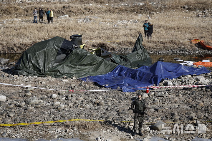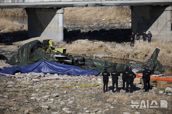 【NEWSIS】京畿道加平郡朝宗面の新下橋近くで9日、AH1S「コブラ」ヘリコプターが墜落し、現場で軍関係者が事故対応に当たっているところ。