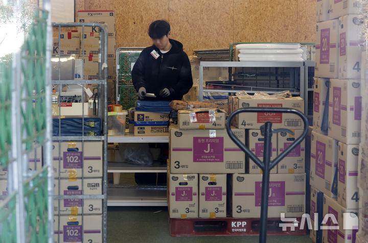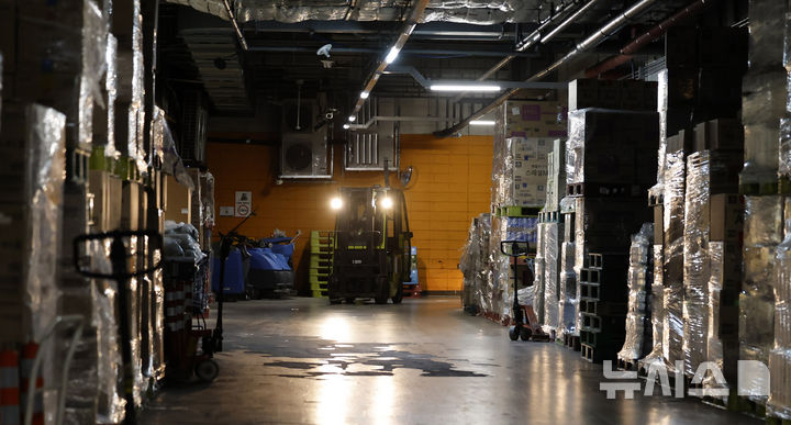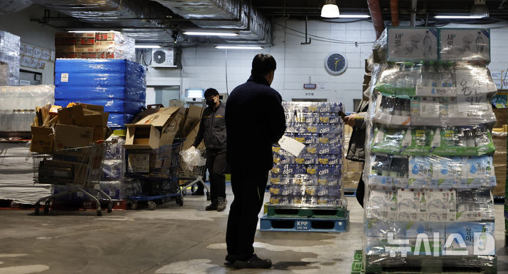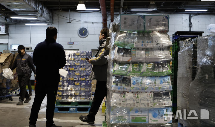 【NEWSIS】韓国政府および与党が、大手スーパーの早朝配送を14年ぶりに解禁すると決めた9日、ソウル市内のある大手スーパーの荷卸し場で業務に当たっている従業員の様子。