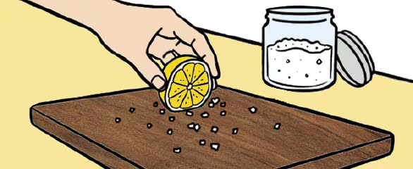 古くなったまな板に粗塩を振りかけ、切ったレモンでこすると、レモンのクエン酸がまな板に染みついたにおいを抑え、汚れも目立たなくなる。
