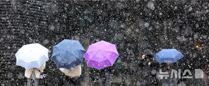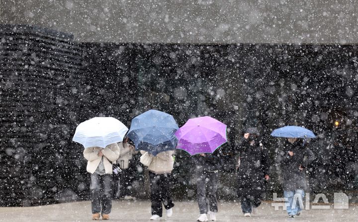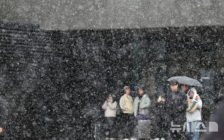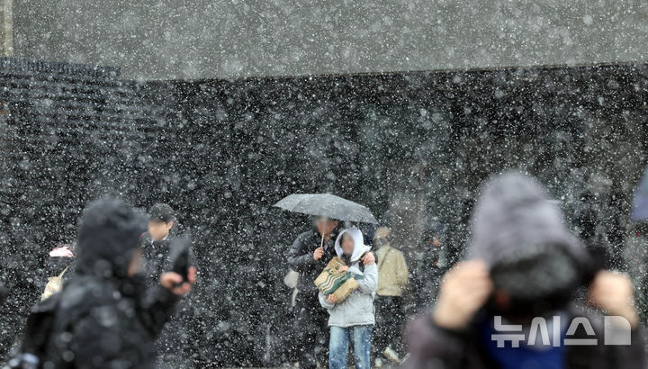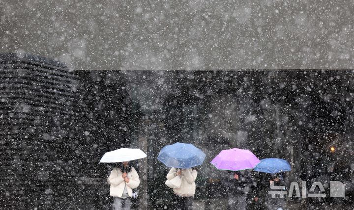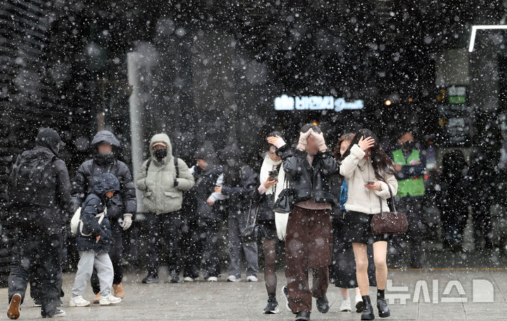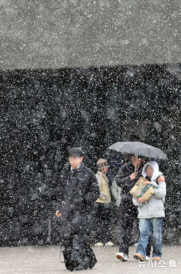 【NEWSIS】なかなか雪を目にすることがない釜山地域にぼたん雪が降った10日、同市東区の釜山駅広場では、市民や観光客が雪の中を行き交っていた。