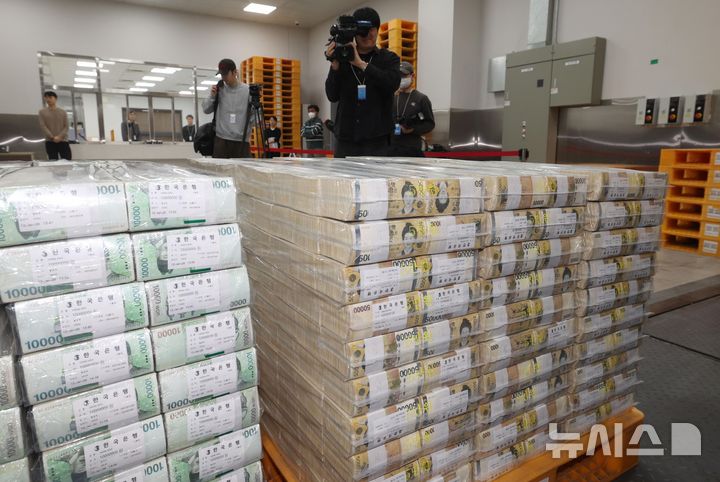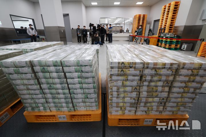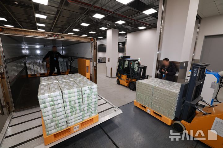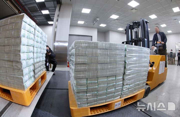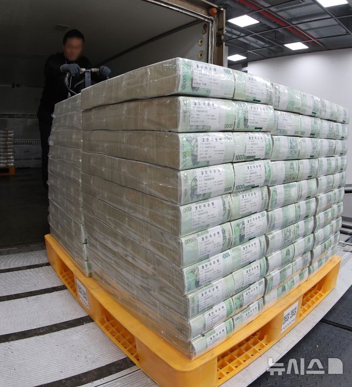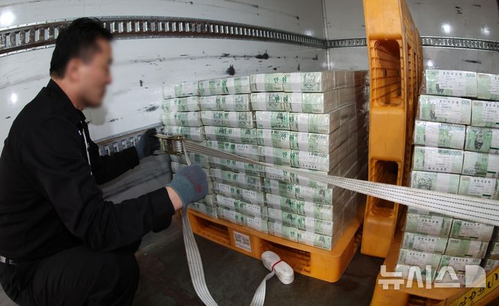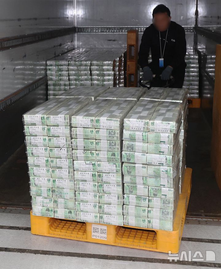 【NEWSIS】旧正月(今年は2月17日)が迫った11日、ソウル市中区の韓国銀行本店で、市中銀行へ供給される旧正月資金の放出作業を行う現金輸送の関係者たち。
