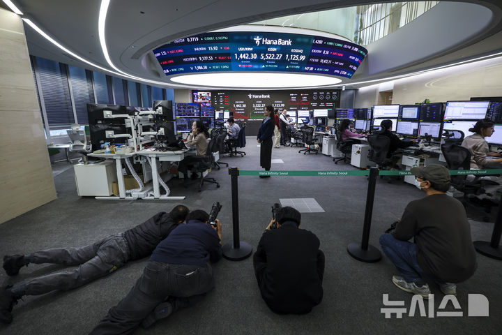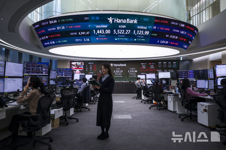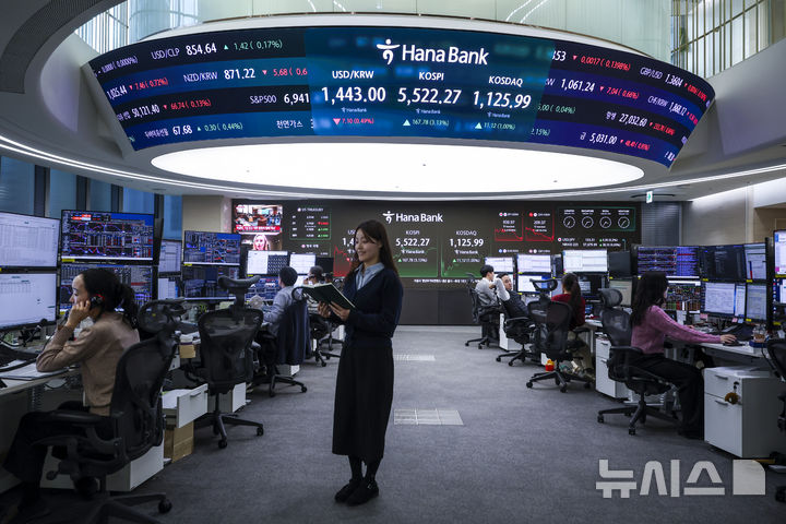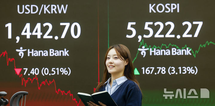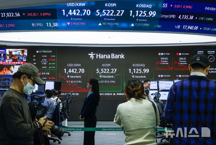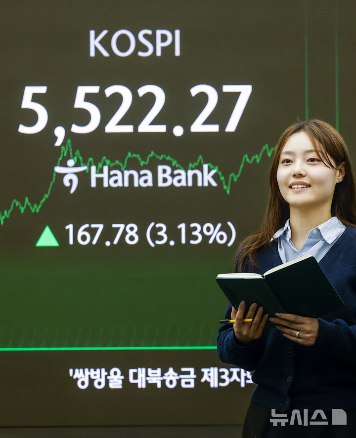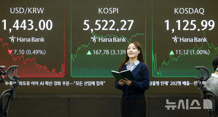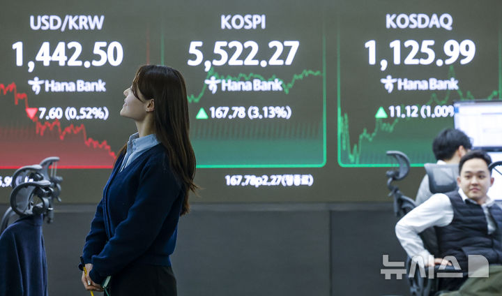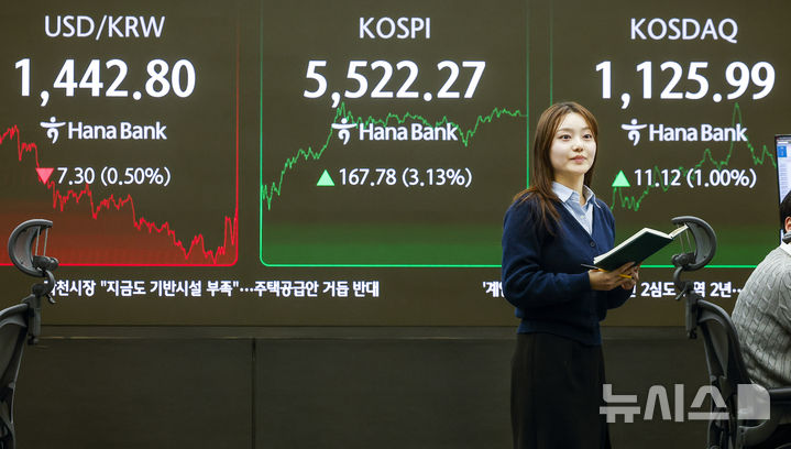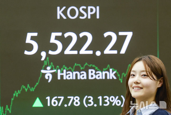 【NEWSIS】韓国総合株価指数(KOSPI)が終値基準で史上初めて5500を突破した12日、ソウル市中区のハナ銀行ディーリングルームの電光掲示板に、KOSPIなどの市況が表示されている様子。KOSPIは前取引日(5354.49)より167.78ポイント(3.13%)高い5522.27、KOSDAQ指数は前取引日(1114.87)より11.12ポイント(1.00%)高い1125.99で取引を終えた。