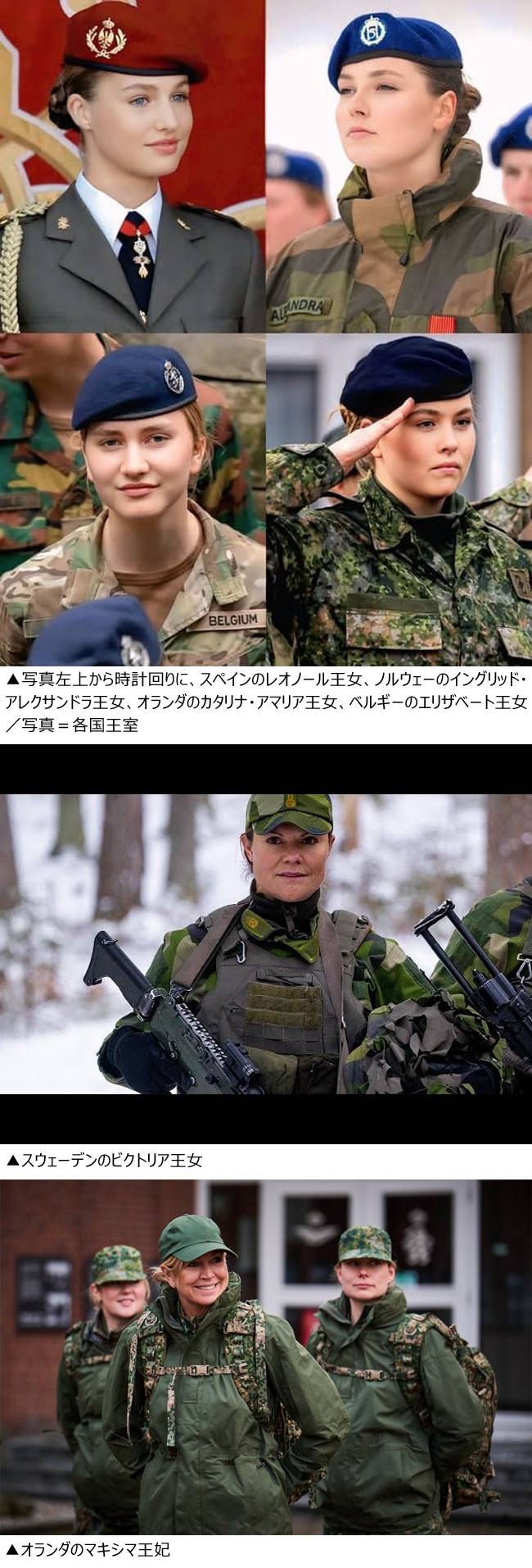 国民を保護する君主が戦争を自ら遂行するという伝統が残っている欧州で、王室構成員の軍務は欠かせない。英国の故エリザベス2世も、王女時代に第2次大戦に参戦した。欧州各国の王位継承者の相当数が女性という状況で、安全保障環境まで危うくなり、各国王室が「戦時の女王」のイメージを掲げて君主制の存続を図っているという側面もある。