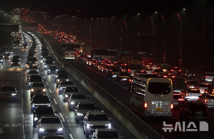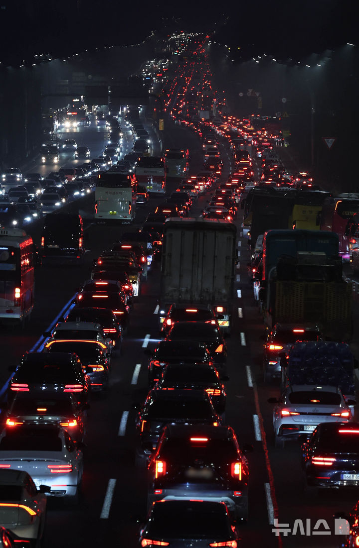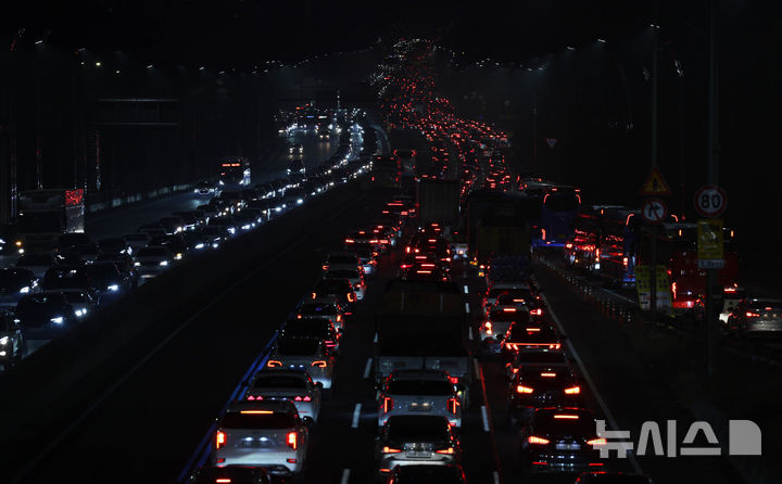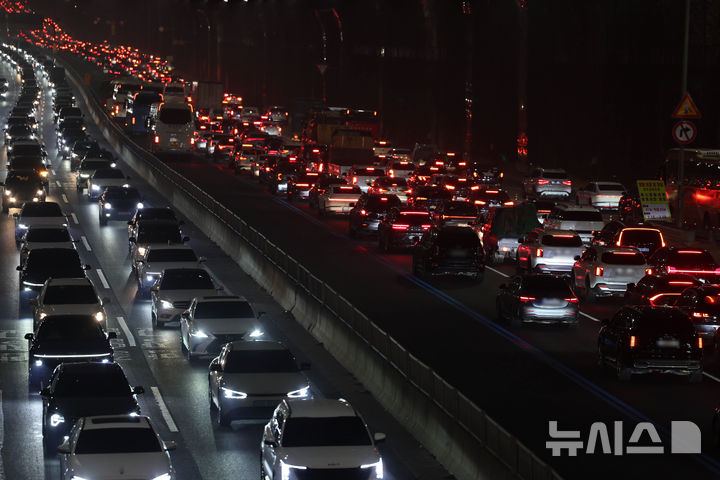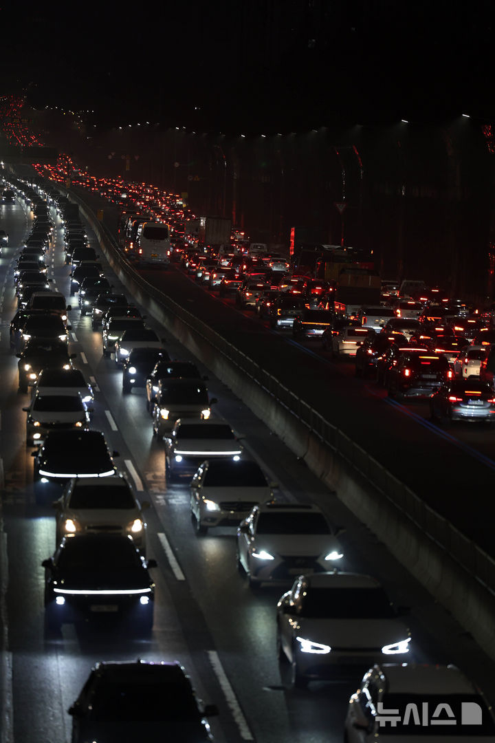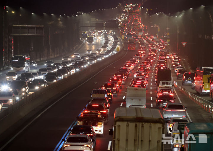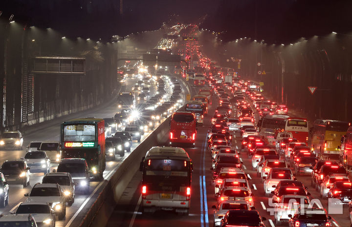 【NEWSIS】旧正月(今年は2月17日)連休スタート前日の13日午後、ソウル市瑞草区の京釜高速道路蚕院インターチェンジ付近の下り線の様子。早くも帰省のための車が長く連なり、渋滞が始まっていた。