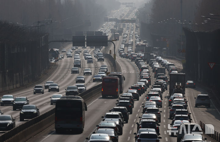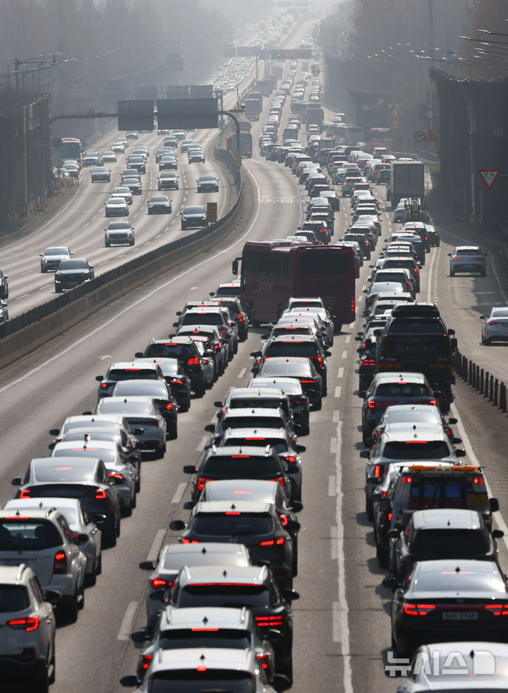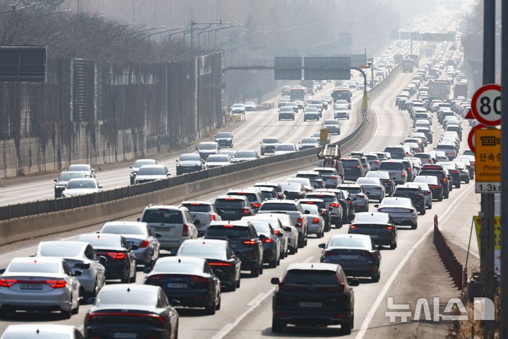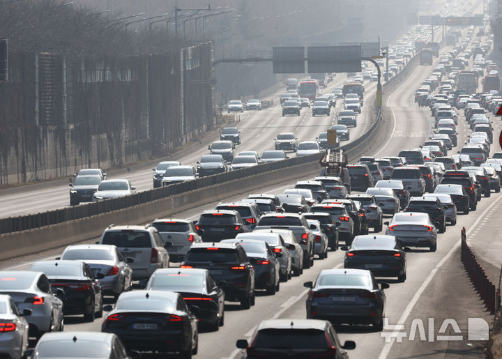 【NEWSIS】旧正月連休(今年は2月14-18日)2日目の15日、ソウル市瑞草区の蚕院インターチェンジで、渋滞している京釜高速道路下り線の様子。