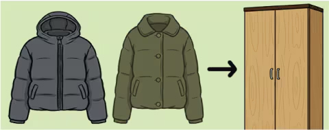 冬に着たダウンジャケットはファスナーとボタンの両方を閉めて保管しよう。次のシーズンに取り出して着る時、型崩れしていない状態で着られる。