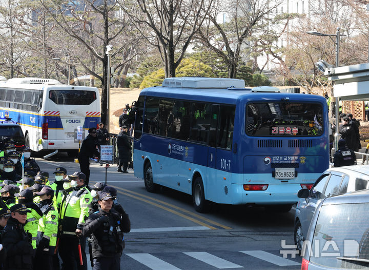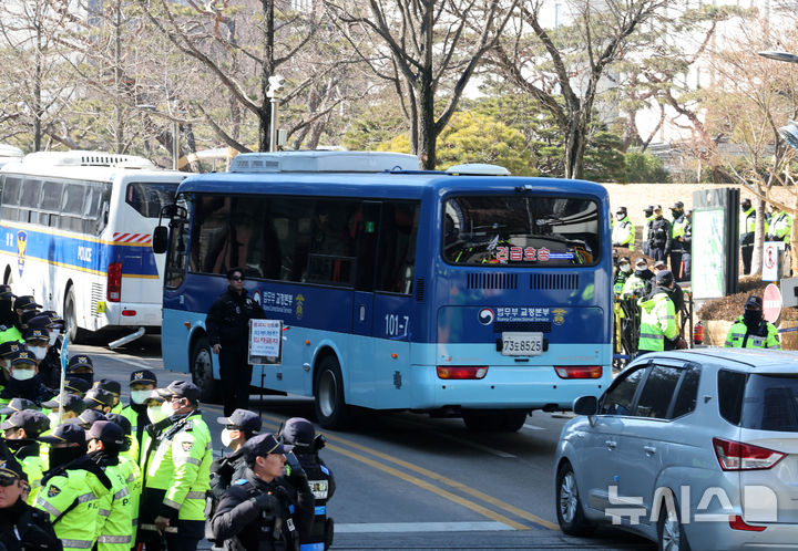 【NEWSIS】韓国の尹錫悦(ユン・ソンニョル)前大統領の内乱首謀者容疑事件の一審宣告期日を迎えた19日午後、ソウル市瑞草区のソウル中央地裁に、前大統領を乗せた護送車が入っていくところ。