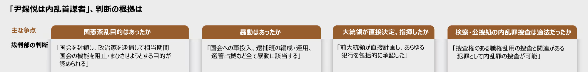 「韓国憲法上の非常戒厳の要件である戦時・事変でないにもかかわらず戒厳を宣布したから内乱」という特検の主張も、裁判部は受け入れなかった。この点に関連して裁判部は「戒厳宣布の要件を具備したかどうかは大統領の判断を尊重すべきであって、これを司法府の判断対象にすることは適切ではない」とした。ただし、「戒厳宣布は大統領の非常大権であって司法審査の対象にならない」という尹・前大統領側の主張も棄却した。裁判部は「国会の権限を侵害したり行政・司法の本質的機能を侵害したりする非常戒厳は憲法上・法律上許容されない」「これを目的として戒厳を宣布したら内乱と見なし得る」と述べた。