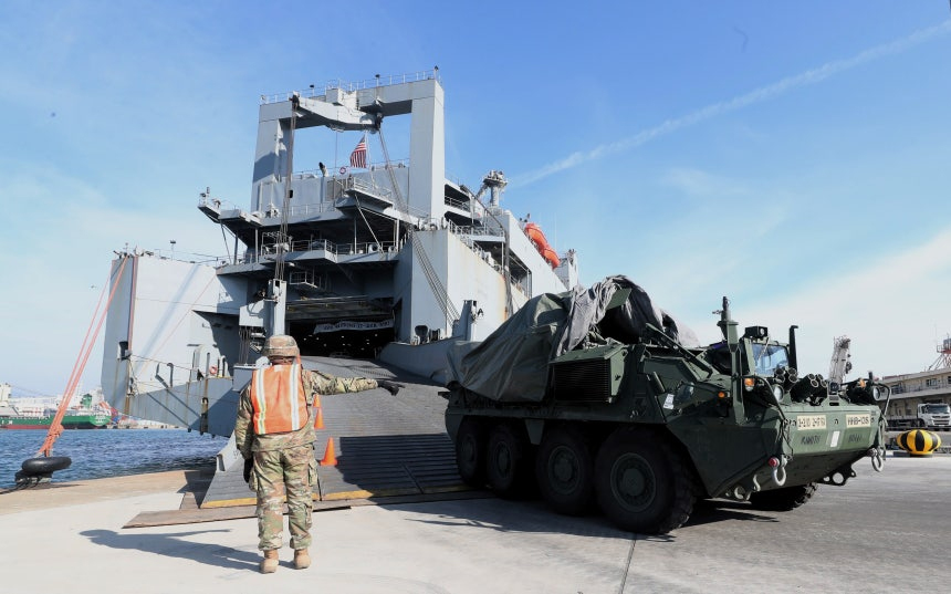 ▲釜山港第8埠頭で装甲車などを輸送船から降ろす米第2師団所属の第2ストライカー旅団。この部隊は韓国に循環配置されている。2月4日午前撮影。/キム・ドンファン記者