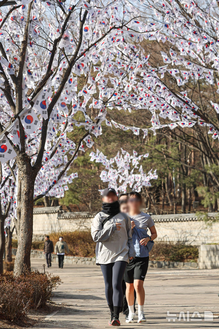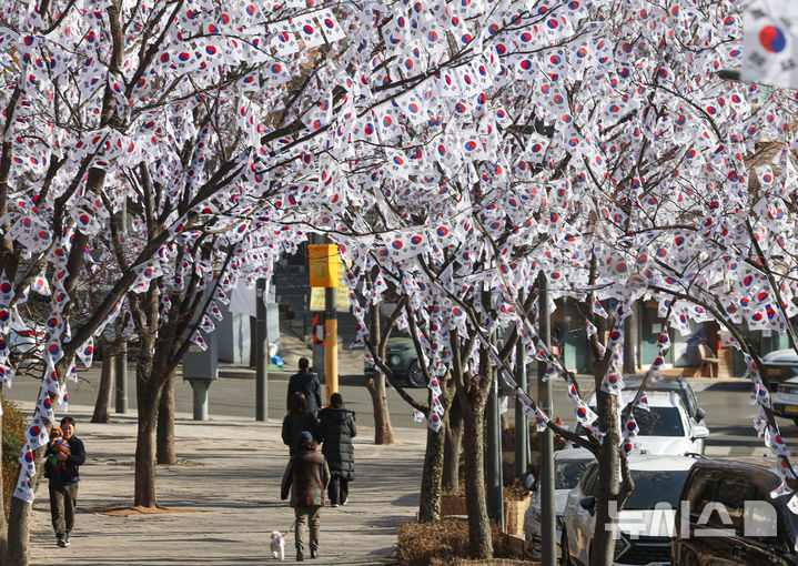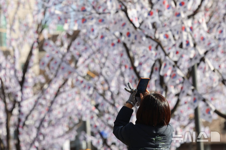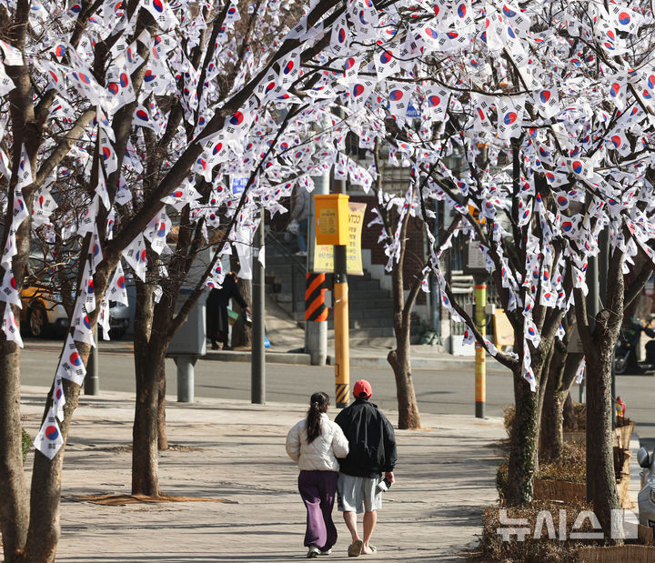 【NEWSIS】独立運動記念日「三・一節」まであと1週間となった22日、孝昌公園(ソウル市竜山区)内の木に掲げられた太極旗(韓国国旗)。