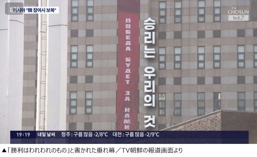 ウクライナに対する西側からの武器支援に韓国政府が参加を検討中と報じられたことを受け、ロシアが「支援すれば報復する」と反発を強めています。また駐韓ロシア大使館は、戦争に勝つ意志を強調する大型の垂れ幕を大使館の建物に設置しました。韓国政府はこれに懸念を伝えましたが、大使館側は撤去に応じず問題になっています。パク・チェフン記者がお伝えします。