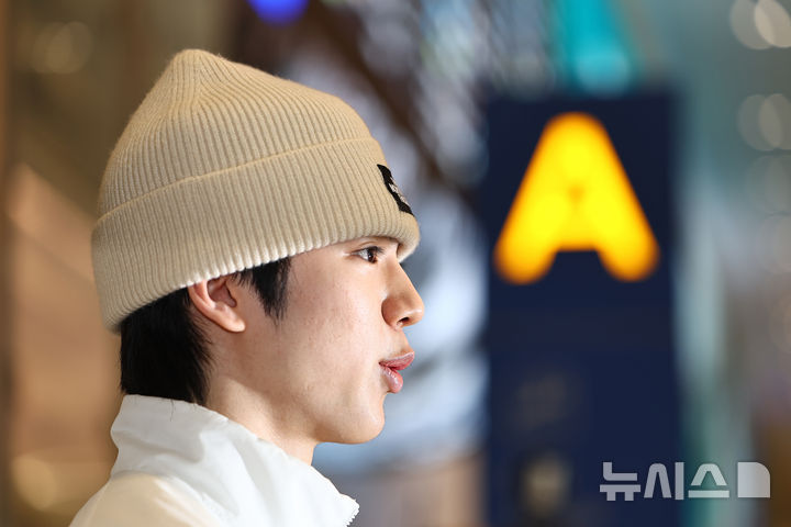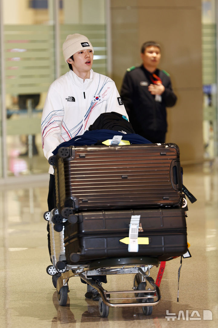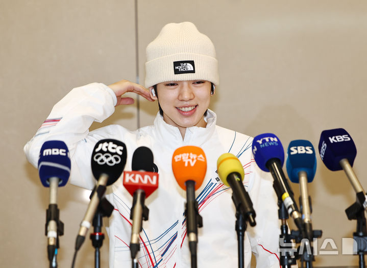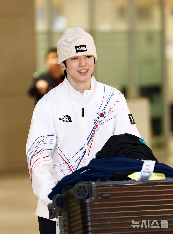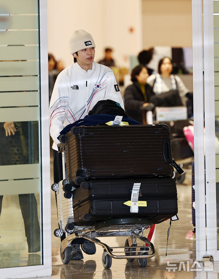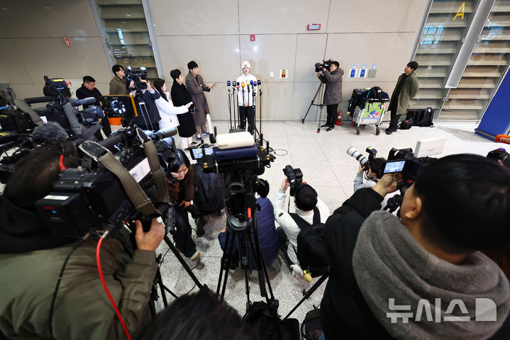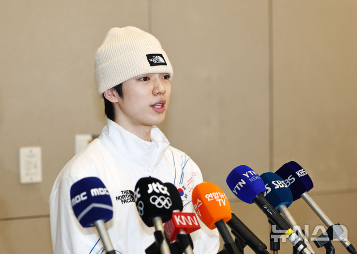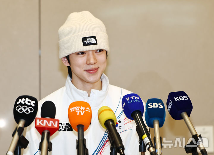 【NEWSIS】フィギュアスケート男子韓国代表の車俊煥(チャ・ジュンファン)が23日午後、2026ミラノ・コルティナ冬季五輪を終えて韓国に戻った後、仁川国際空港第2旅客ターミナルで記者会見を行っている様子。車俊煥は今回の冬季五輪において、フィギュアスケート男子シングルで過去最高の4位を記録した。
