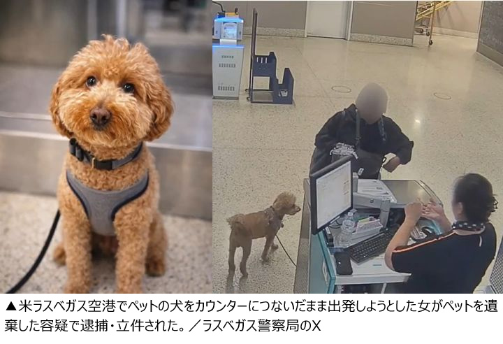 【NEWSIS】米ラスベガス空港でペットの犬をカウンターにつないだまま出発しようとした女が、ペットを遺棄した容疑で逮捕・立件された。