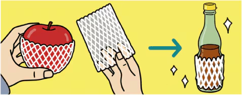果物を一つずつ包むためのフルーツキャップ(ネット状の緩衝材)は捨てずに、食用油の瓶にかぶせると、油がこぼれても手を滑らせて落とす心配がなくなる。