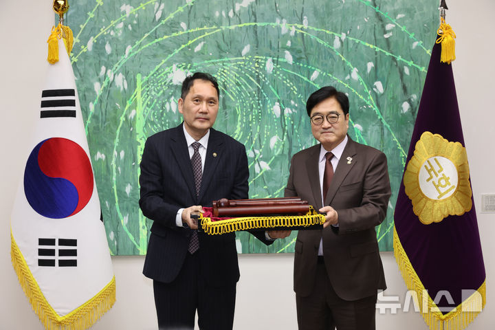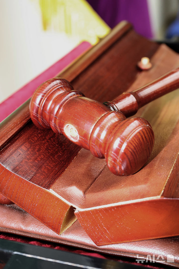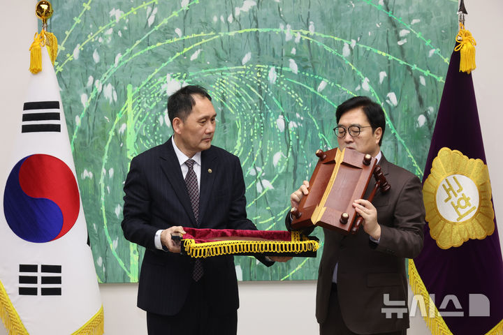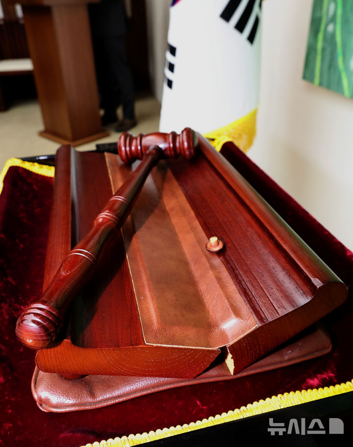 【NEWSIS】禹元植(ウ・ウォンシク)国会議長が25日、ソウル市汝矣島の韓国国会で開かれた国会記録院第1号記録物寄贈式典で、12・3非常戒厳解除と尹錫悦(ユン・ソンニョル)前大統領弾劾訴追案を議決した当時使用し、破損した議事棒と議事棒台を見せている様子。
