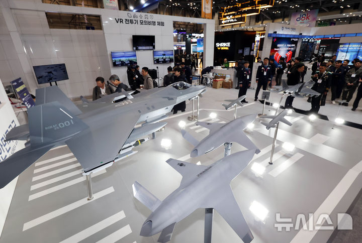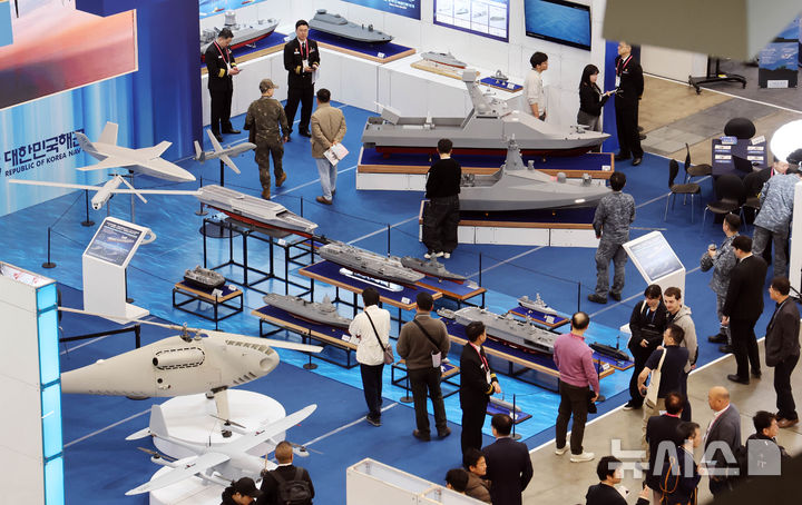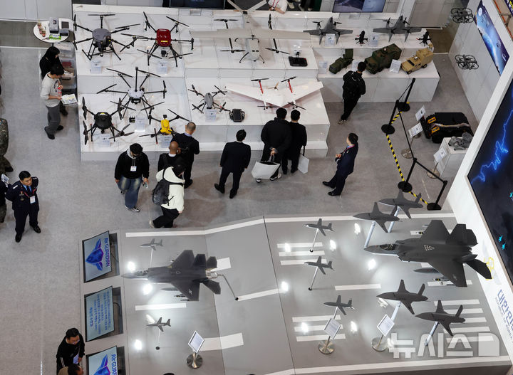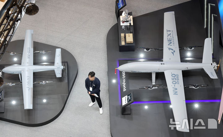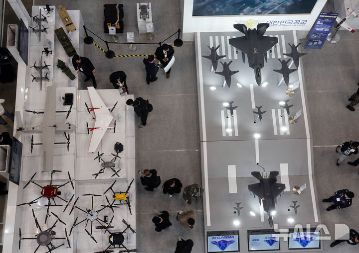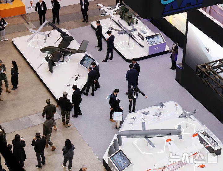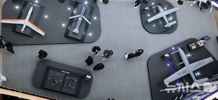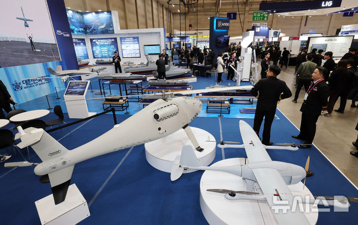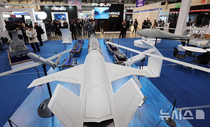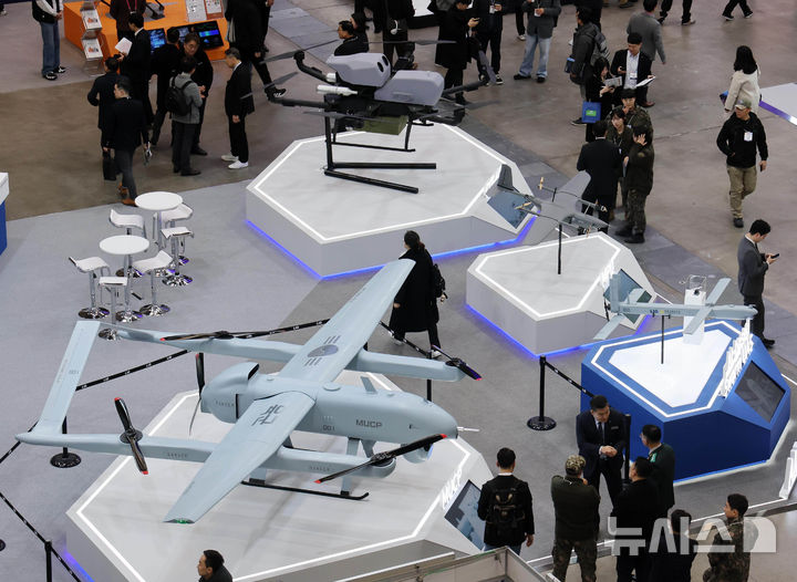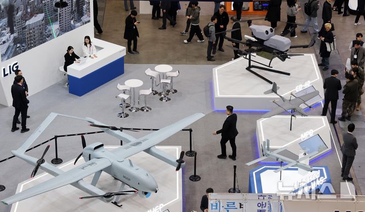 【NEWSIS】アジアを代表するドローン展示会「DSK2026(ドローンショー・コリア)」が開幕した25日、釜山市海雲台区のBEXCO第1展示場で、訪れた人々がフィジカルAI亜音速無人機をはじめAI小型多目的無人機、小型打撃無人機、通信中継ドローンなどを見て回っている様子。