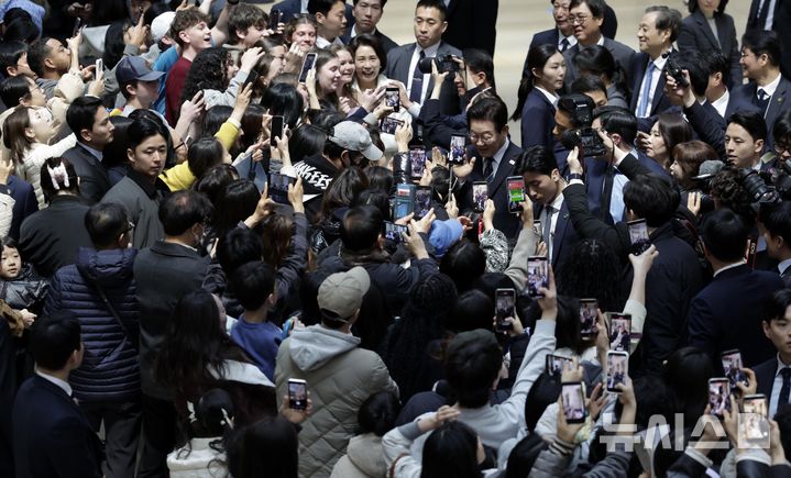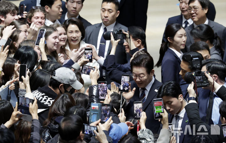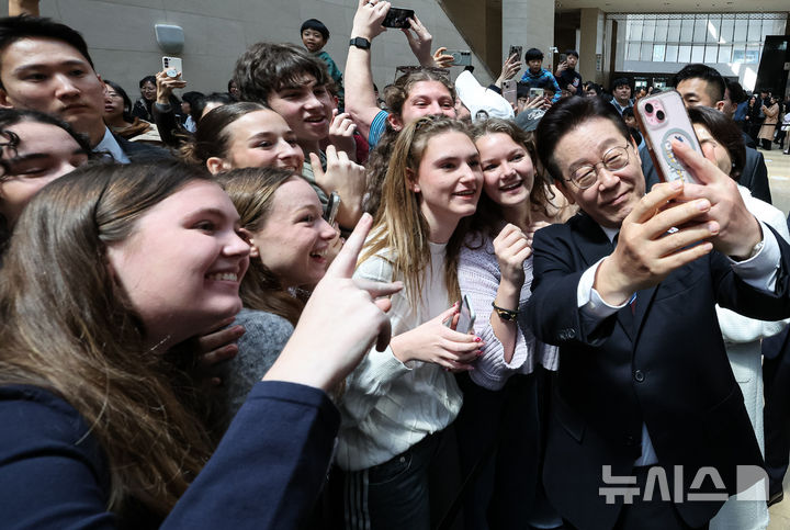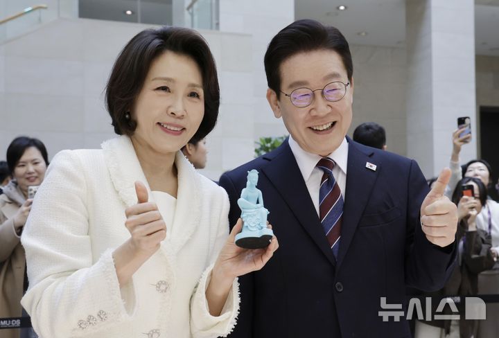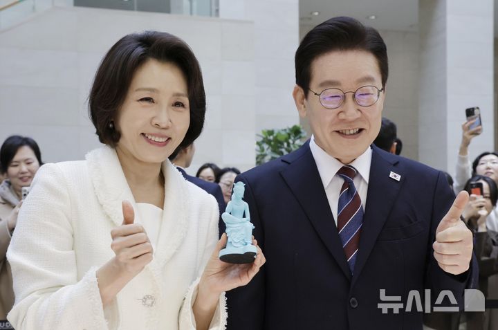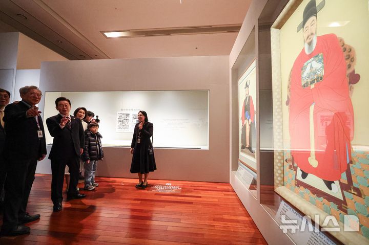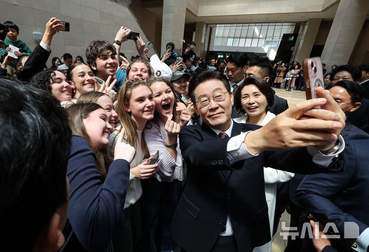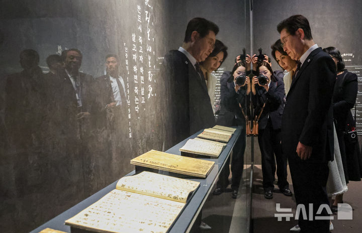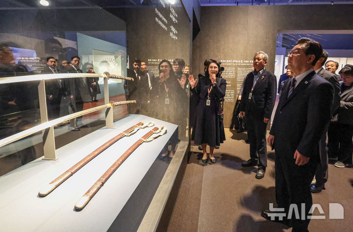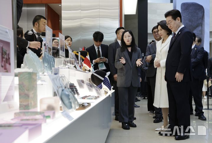 【NEWSIS】韓国の李在明(イ・ジェミョン)大統領と配偶者である金恵京(キム・ヘギョン)夫人が26日、ソウル市竜山区の国立中央博物館を訪れて光復80周年記念特別展「私たちの李舜臣」展を観覧した後、観光客と記念撮影をしている様子。
