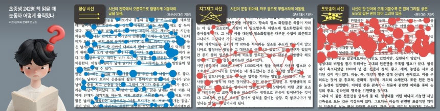 忠清南道教育庁の読解力検査で教科書を最後まで読めなかった生徒たちは、共通して読書方法に大きな問題が見受けられた。研究チームは、カメラで読書中の生徒の眼球の動きを追跡する「視線追跡検査」を実施した。生徒の視線に沿って紙面上に点や線が描かれ、そのパターンを分析して読書方法と能力を診断する方法だ。