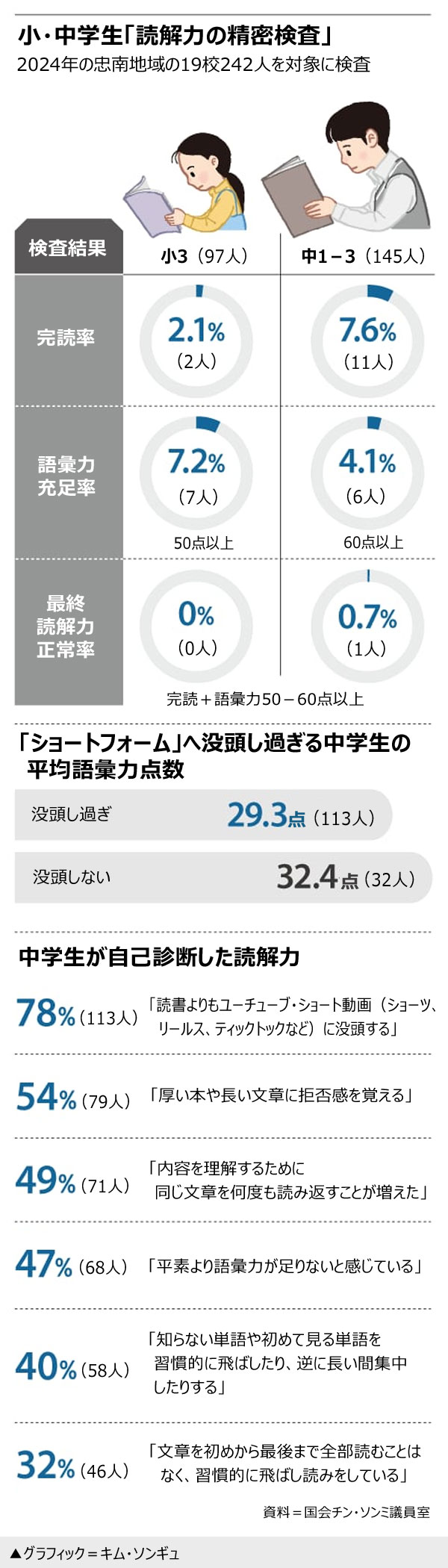 研究チームが2023年に忠清南道地域の小・中学生158人を対象に実施した調査でも、同様の結果が出た。小学生の72%、中学生の93%が時間内に完読できなかった。難読・文解力研究所のパク・セダン所長は「ランダムに抽出した生徒の相当数が教科書の文章を最後まで読めなかったことから、10代の読解力低下は非常に広範かつ深刻だと思われる」と述べた。