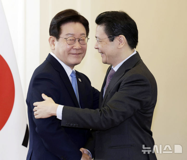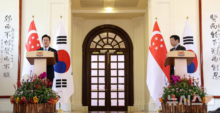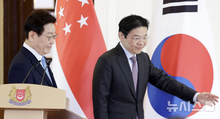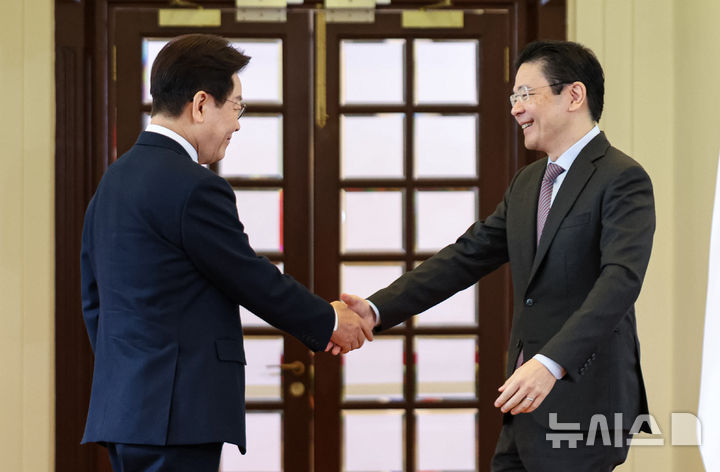 【NEWSIS】シンガポールを国賓訪問中の韓国の李在明(イ・ジェミョン)大統領が2日(現地時間)、シンガポール外務省でローレンス・ウォン首相と共同メディア発表を終えた後、握手をしている様子。