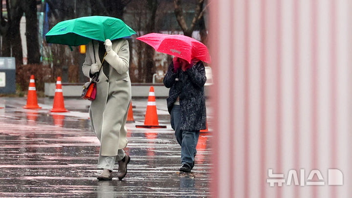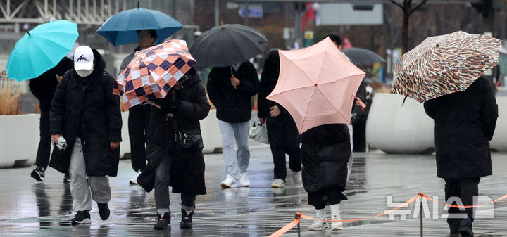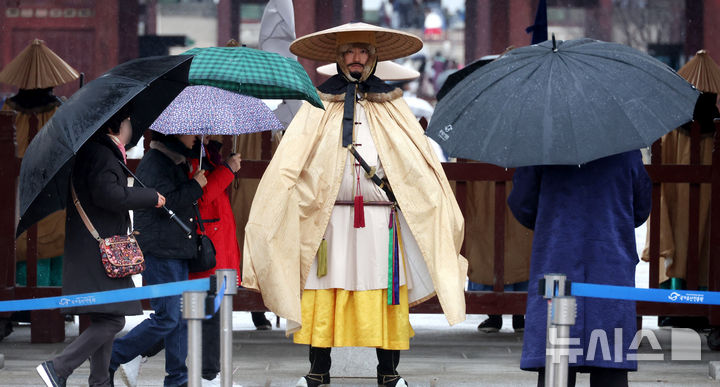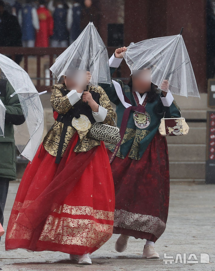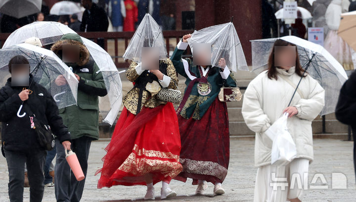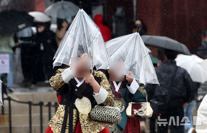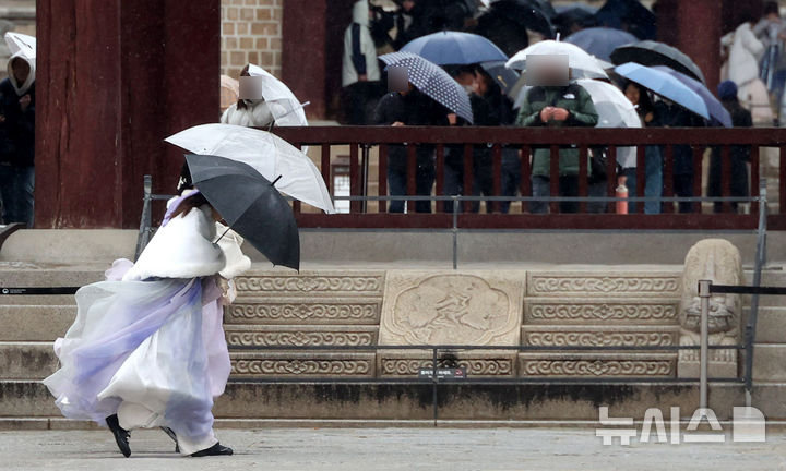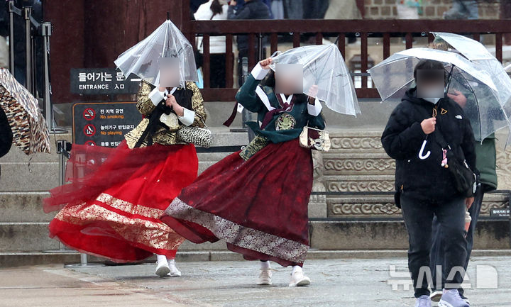 【NEWSIS】強風を伴う雨が降った2日午前、ソウル市鍾路区の景福宮では、外国人観光客が傘を差して歩みを急いでいた。
