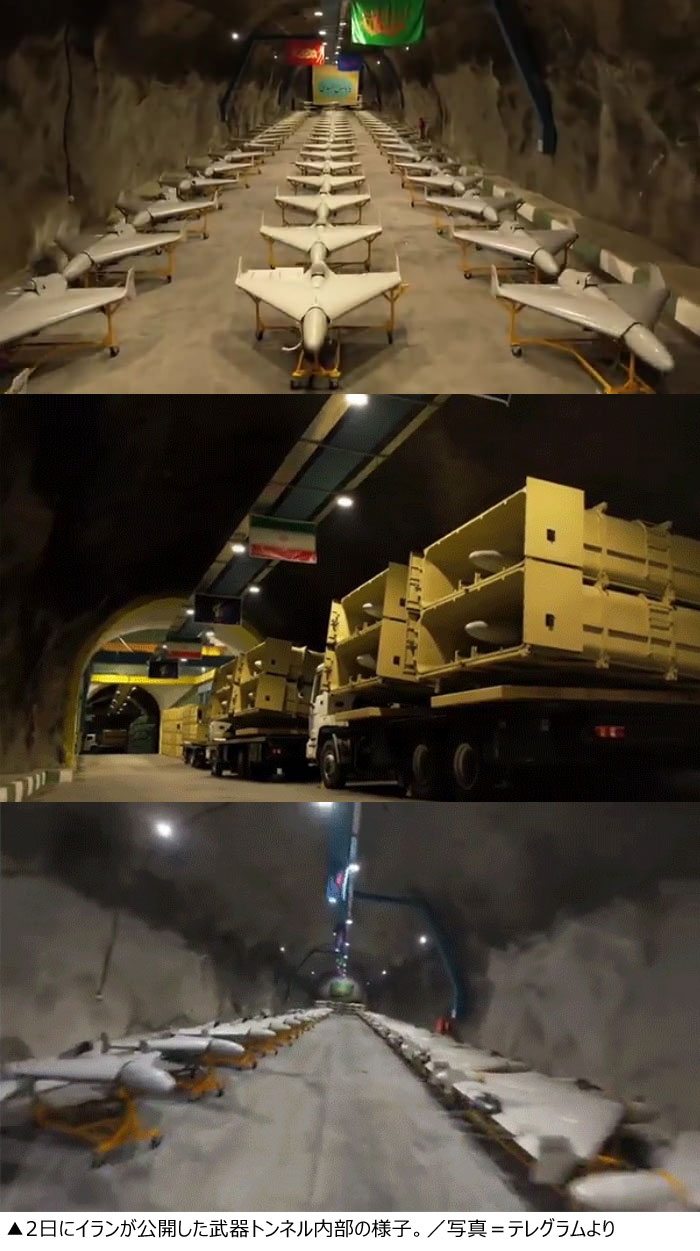 米国とイスラエルの合同空襲に対する反撃に乗り出したイランが、ドローンやミサイルなどを保管しているトンネルの様子を公開した。