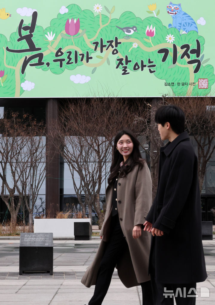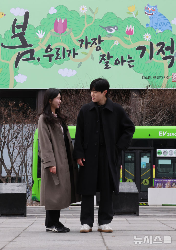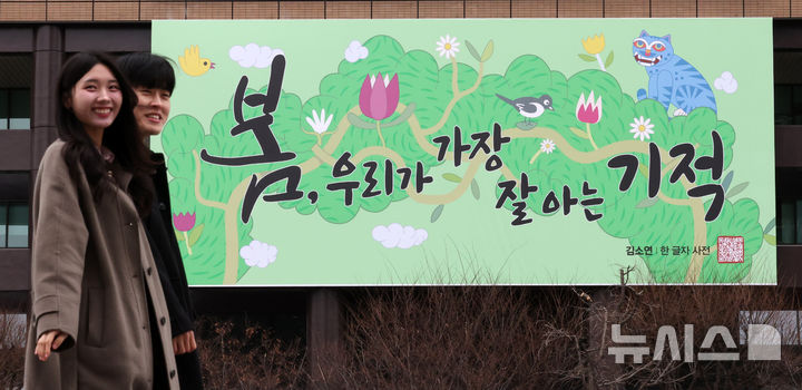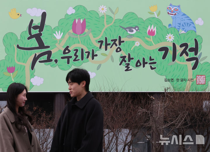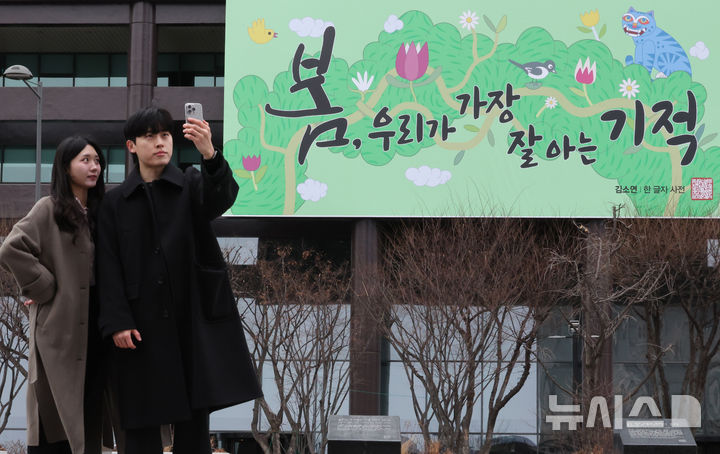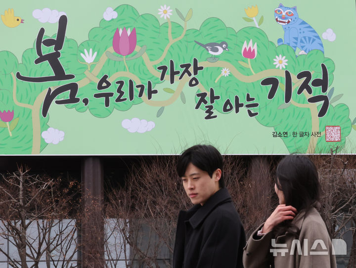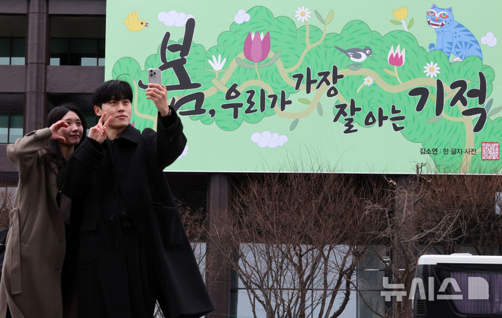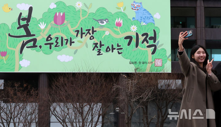 【NEWSIS】3日午前、ソウル市鍾路区の教保生命ビル外壁にある「光化門掲示板」が春バージョンに模様替えし、「春、私たちが最もよく知っている奇跡」というメッセージが掲示された。今回の光化門掲示板のメッセージは、詩人キム・ソヨンの散文集「ある文字の辞典」からの抜粋だ。