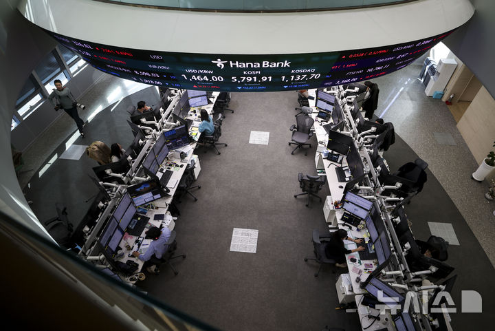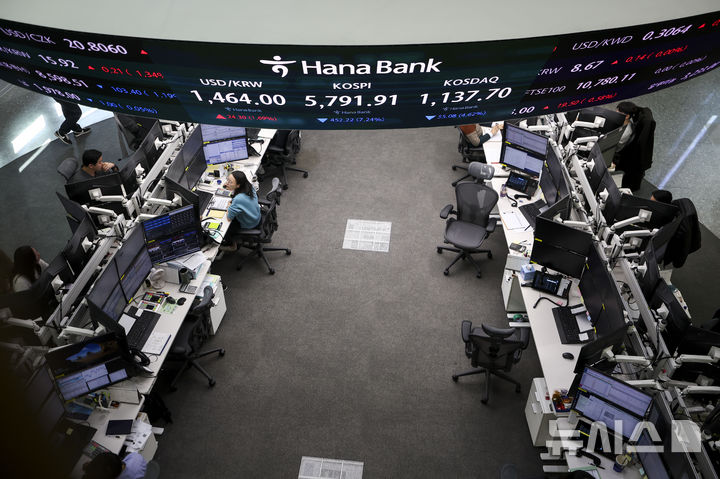【NEWSIS】3日、ソウル市中区のハナ銀行ディーリングルームにある電光掲示板に、韓国総合株価指数(KOSPI)など証券市場の終値が表示されている様子。