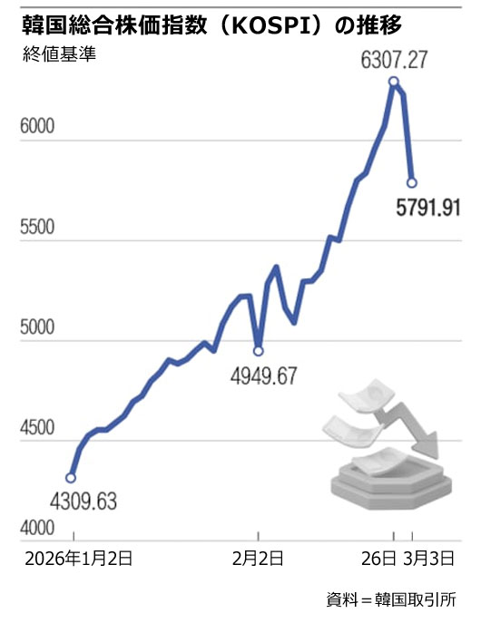 この日のKOSPI急落は、先月28日の米国によるイラン空爆以降で初めての取引日だったことが影響したと分析されている。韓国の株式市場が三一節(1919年3月1日の独立運動を記念する日)の振り替え休日で取引がなかった2日に、香港ハンセン指数(-2.14%)や日本の日経平均(-1.35%)などアジア主要国の株式市場は下落して取引を終えた。ただし、2日の米株式市場はイラン攻撃の影響があったのにもかかわらず、ダウ(-0.15%)、ナスダック(+0.36%)、S&P 500(+0.04%)などの終値だった。