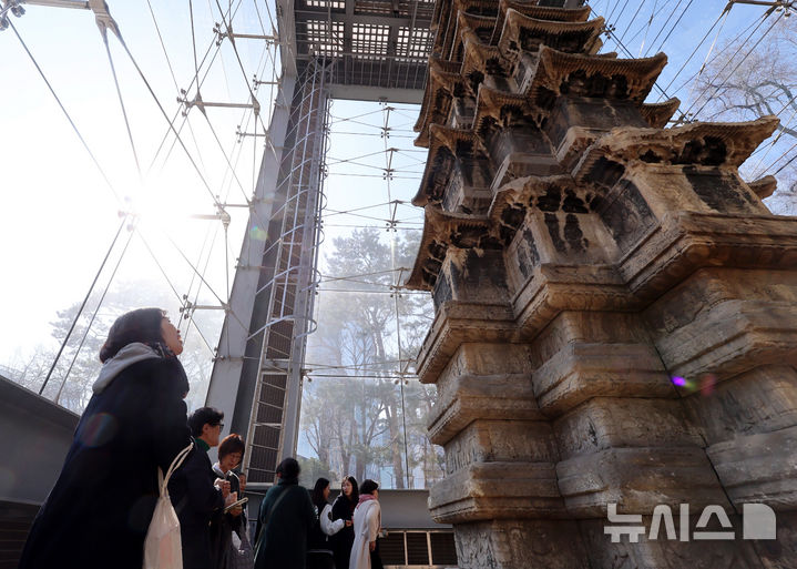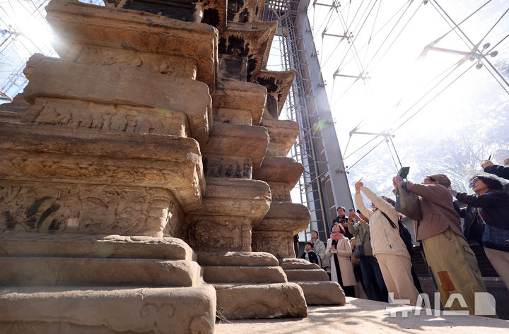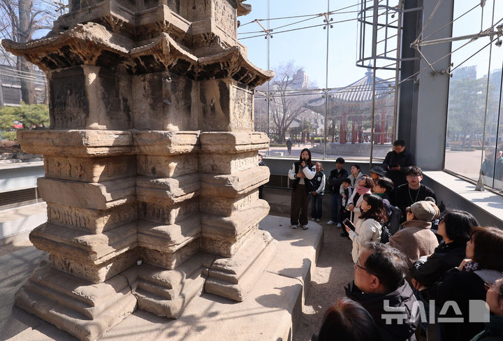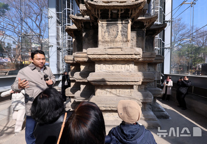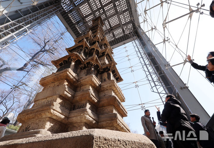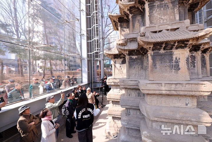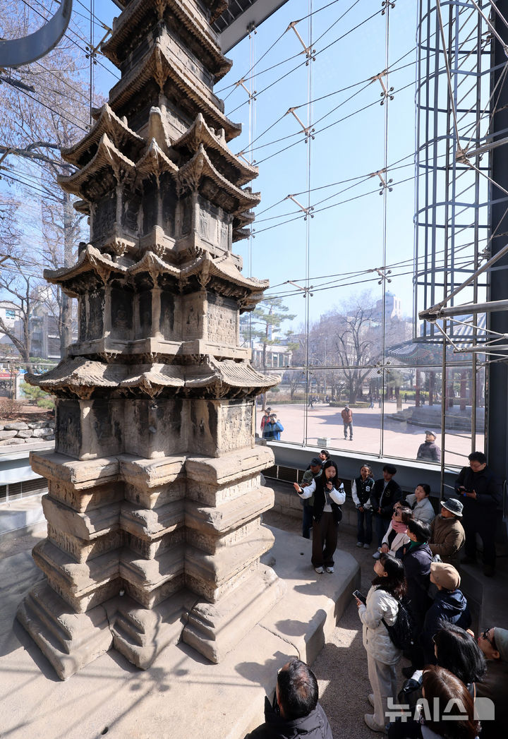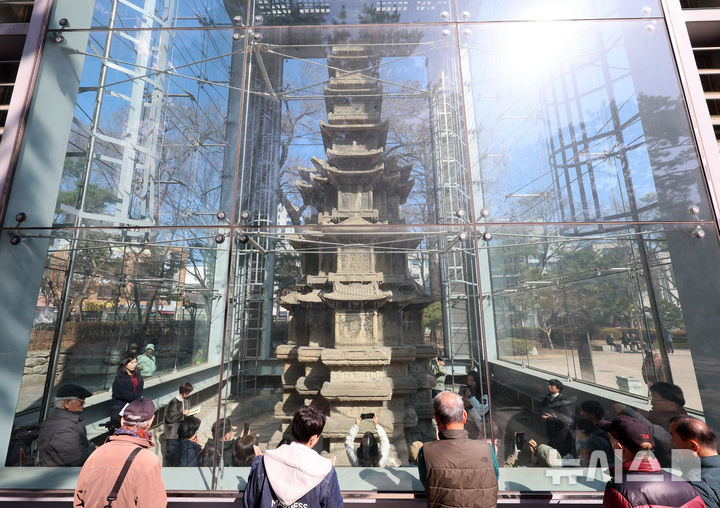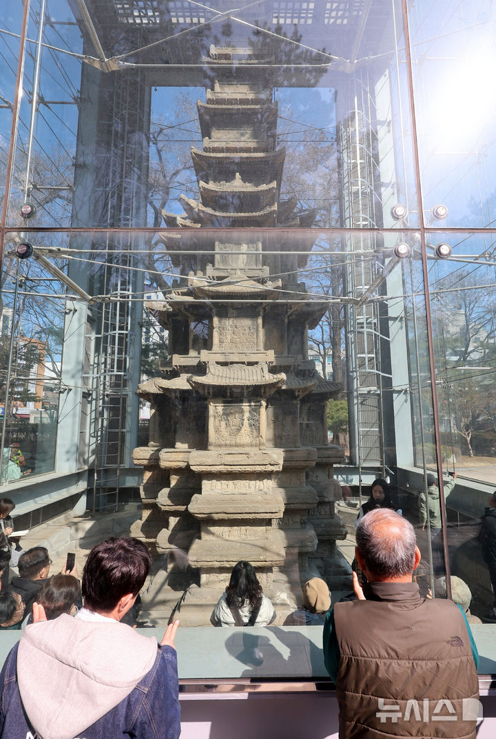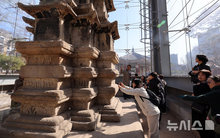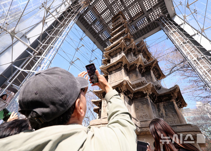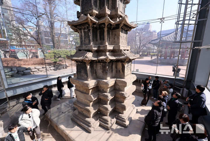 【NEWSIS】ソウル市鍾路区のタプコル公園で4日午後、韓国の国宝第2号「圓覚寺址十層石塔」を見て回る市民の様子。